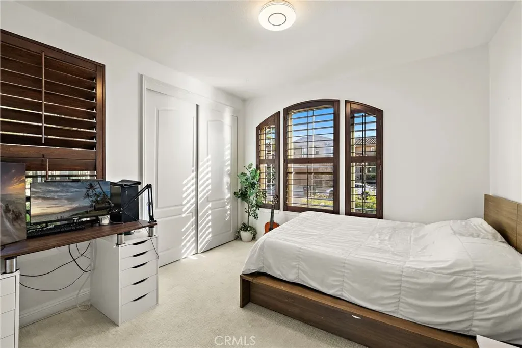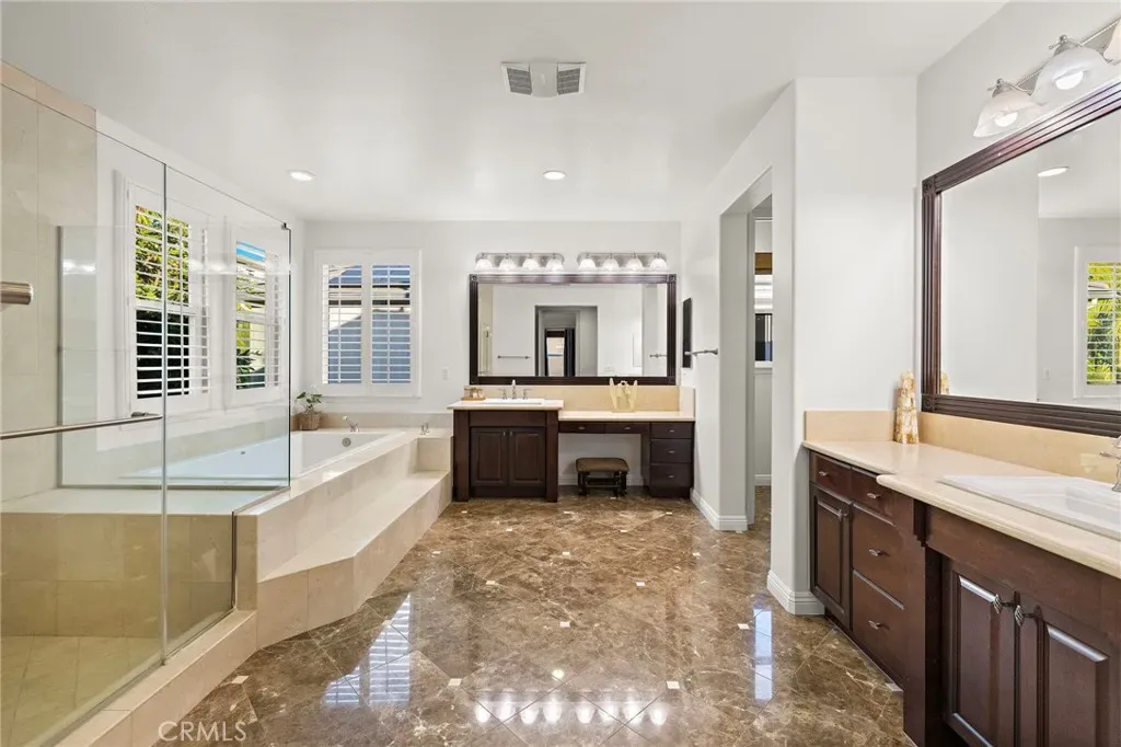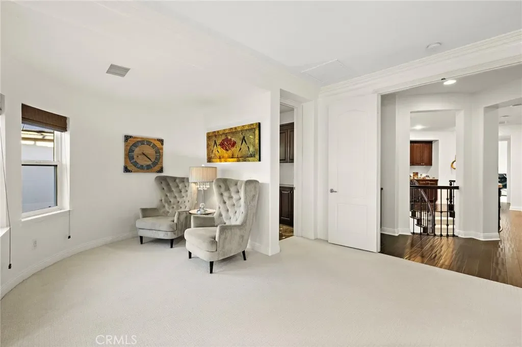 Upstairs, the primary suite offers a private retreat with a comfortable sitting area, oversized walk-in closet, and spa-inspired bath featuring dual vanities, a soaking tub, and walk-in shower. A built-in workspace on the second level adds flexibility for remote work or study.