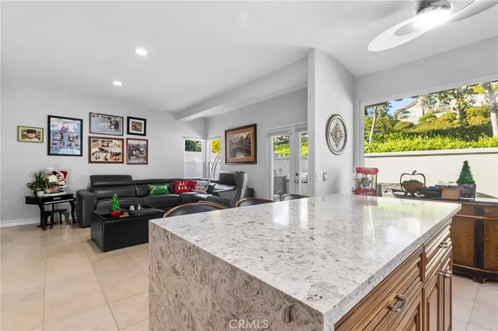 This beautifully remodeled Marina Hills residence showcases extensive upgrades throughout, including the kitchen, bathrooms, flooring, windows, electrical, HVAC, plumbing, and lighting. Double entry doors open to soaring ceilings and abundant natural light, highlighting the home’s open and functional floor plan. The upgraded kitchen features travertine flooring, light quartz countertops, a waterfall-edge island, soft-close cabinetry, a touch-free faucet, stainless steel appliances, and a built-in oven and microwave. The spacious family room offers floating shelves and a sleek entertainment center and flows seamlessly into the kitchen—perfect for everyday living and entertaining. A first-floor bedroom and adjacent full bathroom with a tiled shower provide ideal accommodations for guests or multi-generational living. Upstairs, an expanded hallway leads to the primary suite, where a white sliding barn door opens to a versatile bonus space ideal for a home office or oversized walk-in closet. Large windows offer peaceful greenbelt views, while the spa-like primary bathroom features a freestanding jetted soaking tub, glass-enclosed shower with rainfall showerhead, and custom tile extending to the ceiling. Two additional upstairs bedrooms share a beautifully remodeled Jack-and-Jill bathroom with a full shower. The private backyard is designed for relaxation and entertaining, featuring a shaded patio with a large retractable awning, light posts with solar lanterns, a fire table, garden planters, and a 2 year old dwarf lemon tree. Smart home features include a Vivint whole-home security system, Ecobee energy-saving thermostat, and a Samsung smart refrigerator with a digital display. Energy-efficient enhancements include cordless window shades, upgraded dual-pane windows, and a SunCoat Max coating on the oversized kitchen picture window. The spacious three-car garage offers built-in overhead shelving, attic storage, and a 240V outlet ready for EV charging. Marina Hills amenities include a pool, tennis and pickleball courts, clubhouse, BBQ areas, parks, playgrounds, and more. Enjoy easy access to the scenic 4-mile Salt Creek Trail leading directly to Salt Creek Beach.