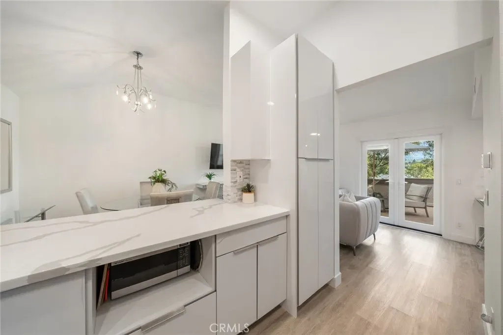 Welcome to this beautifully upgraded two-bedroom, two-bathroom upper corner condo in the highly desirable Villa Mira community of Laguna Niguel. Ideally situated for maximum privacy, this light-filled home offers vaulted ceilings and abundant natural light throughout. The remodeled kitchen showcases sleek European-style soft-close cabinetry, quartz countertops, and a full suite of stainless-steel appliances including a Bosch dishwasher, gas stove with stainless hood vent, microwave, and refrigerator — perfect for both everyday living and entertaining. Additional upgrades include newer dual-pane windows and sliding patio doors, as well as a newer A/C system for year-round comfort. Both bathrooms have been tastefully remodeled with modern finishes. Step outside to a spacious private patio where you can relax and enjoy serene city lights and mountain views — the perfect spot for morning coffee or evening unwinding. Enjoy year-round swimming in the community pool. Conveniently located near the 5 and 73 freeways, award-winning schools, Saddleback College and just a short drive to Southern California’s beautiful beaches.