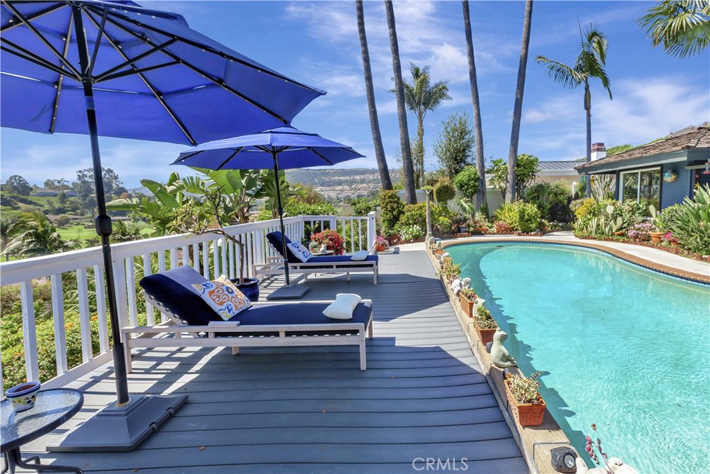 A rare opportunity to acquire a single-level golf course view home on an expansive 12,000 sq. ft. lot in one of Laguna Niguel’s most desirable neighborhoods. This 3-bedroom, 2.5-bath residence offers approximately 2,164 sq. ft. of living space and showcases panoramic views of the private El Niguel Golf Course—a setting that continues to drive significant redevelopment and long-term value along this highly sought-after street. From the moment you arrive, a charming enclosed courtyard and double-door entry create a welcoming introduction. Inside, oversized tile flooring leads into a spacious living room and adjoining dining area, both oriented toward the rear of the home where expansive golf course views take center stage. The backyard is designed for both relaxation and entertaining, featuring a pool and spa, generous patio space, and an elevated view deck—all positioned to capture the full breadth of the surrounding landscape. The home has been thoughtfully updated over time, including enhanced kitchen finishes, custom cabinetry, and a professional-grade gas range and oven. The spacious primary suite offers an upgraded bath with an oversized soaking tub and direct access to the outdoor living areas. Two additional bedrooms are generously sized, while the secondary bathroom has been remodeled with custom tile, updated counters, and an oversized shower. Originally configured as a 3-car garage, the current layout includes a permitted conversion creating a 2-car garage plus integrated office space, offering flexibility for today’s lifestyle needs while retaining the option to revert if desired. Located within the Vista Niguel community, just minutes from world-class resorts including the Ritz-Carlton, Waldorf Astoria, and Montage Laguna Beach, as well as renowned beaches such as Salt Creek and Laguna Beach. With no HOA dues or Mello-Roos, and surrounded by homes that have undergone extensive renovation or new construction—some reaching into the multi-million dollar range—this property presents a compelling opportunity to renovate, reimagine, or build new in a proven luxury corridor. One of the few remaining original homes with this combination of lot size, view, and location—this is where vision meets opportunity.