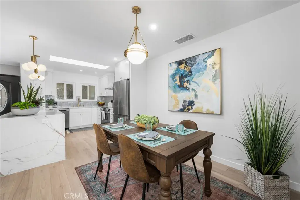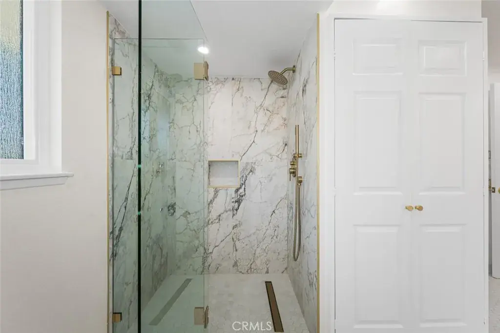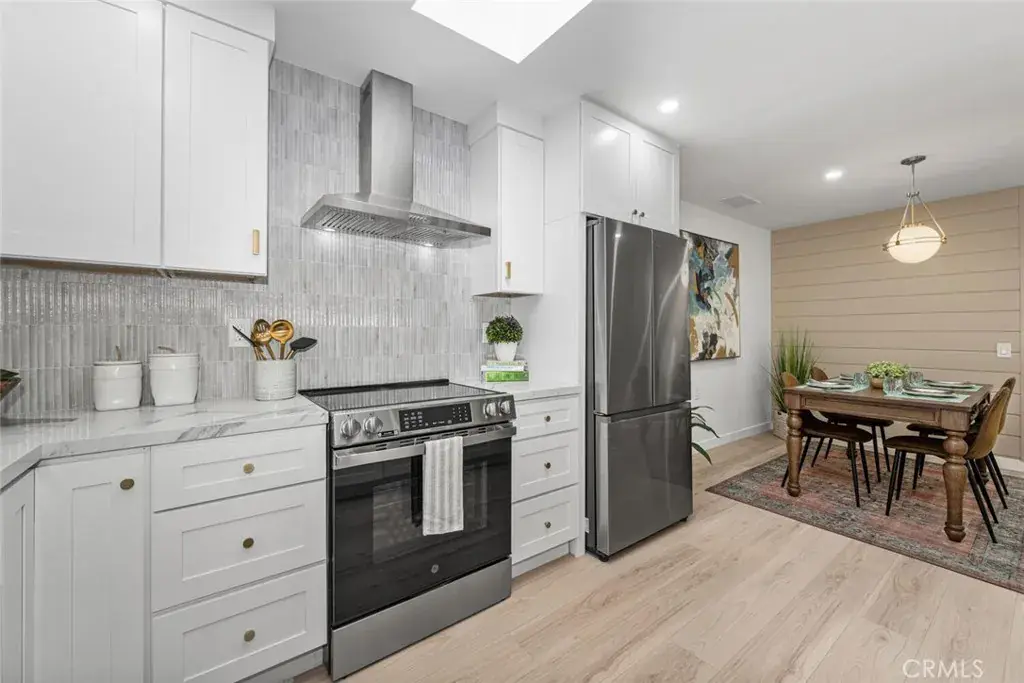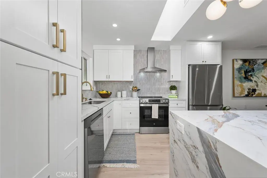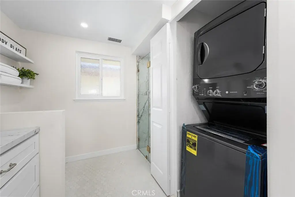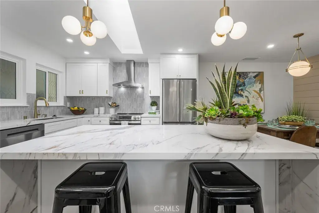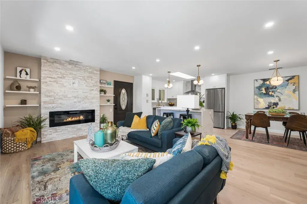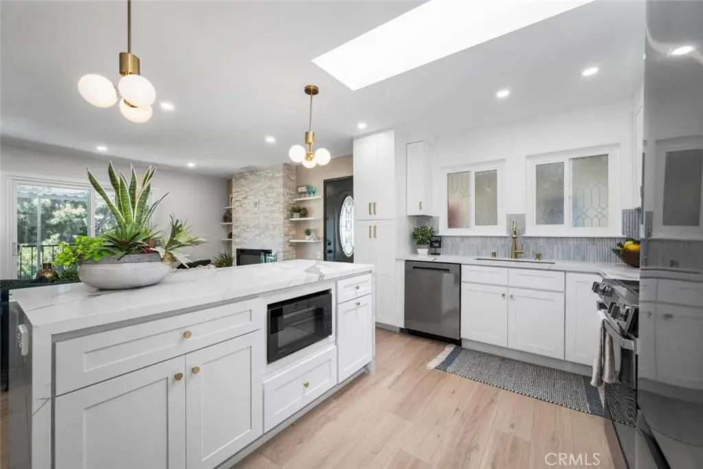 Welcome to this beautifully reimagined top-floor Casa Contenta model home, located in the desirable Third Mutual of Laguna Woods! Step inside to discover a stunning open-concept living space featuring recessed lighting and a custom floor-to-ceiling stone electric fireplace that serves as a striking focal point. Expansive dual-pane sliding doors bring the outdoors in, creating a serene, treehouse-like ambiance with an exceptional sense of privacy—no neighbors in sight. Natural light floods the home through a dramatic skylight that spans the width of the kitchen. The kitchen itself is a true showstopper, thoughtfully updated with sleek quartz countertops, stainless steel appliances, Shaker-style cabinetry, pendant lighting, and an oversized island with a breakfast bar—perfect for entertaining. Adjacent to the kitchen is a dedicated dining area accented by stylish custom lighting fixtures, ideal for hosting dinner parties or casual meals. Down the hallway, you’ll find a beautifully updated guest bathroom featuring a new vanity, a fully tiled roll-in shower, and a glass enclosure. The unique floor plan includes a private primary suite, complete with a luminous white bathroom boasting quartz counters, a tiled floor, and a low-threshold glass-enclosed shower. Additional highlights include high-quality laminate flooring throughout, central air conditioning, and an in-unit washer and dryer for your convenience.This home is ideally situated within Laguna Woods, allowing residents to take full advantage of its amenities. Laguna Woods Village residents are privileged to enjoy a 27-hole championship golf course, a 9-hole executive par 3 course, pickleball and tennis courts, lawn bowling, gyms, clubhouses, swimming pools, horse stables, gardening centers, an art studio, a world-class wood shop, computer workrooms and classes + over 200 clubs and organizations!