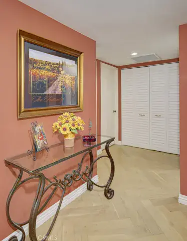 Welcome to 3111-P Via Serena South – a gorgeous remodeled two-bedroom, two-bath, upper LA BRISA residence in the Laguna Woods senior community. Situated in a quiet cul-de-sac far from busy roads and noisy highways, this home boasts a spectacular panoramic view of trees, hills and the Saddleback Mountains. The rear balcony is the perfect setting for outdoor entertaining, dining and relaxing while taking in the lovely view. The highly upgraded kitchen features ample cabinet storage with convenient pull-out drawers, a built-in recycling drawer, beautiful stone countertops and stainless-steel appliances. The spacious primary bedroom suite has ample closet storage with mirrored doors. The versatile guest bedroom could also serve as a home office, workout room or arts and crafts studio. Additional upgrades throughout the residence include smooth ceilings, crown molding and baseboards, ceiling fans in the bedrooms, plantation shutters, stunning engineered wood oak flooring and central HVAC. Bold colors throughout the home create a warm and welcoming environment. A full-size stackable washer/dryer is conveniently located in a hall closet. The nearby assigned carport has large cabinets for additional storage. Plus, there is ample guest parking in the cul-de-sac and street. Do not miss this beautiful home!