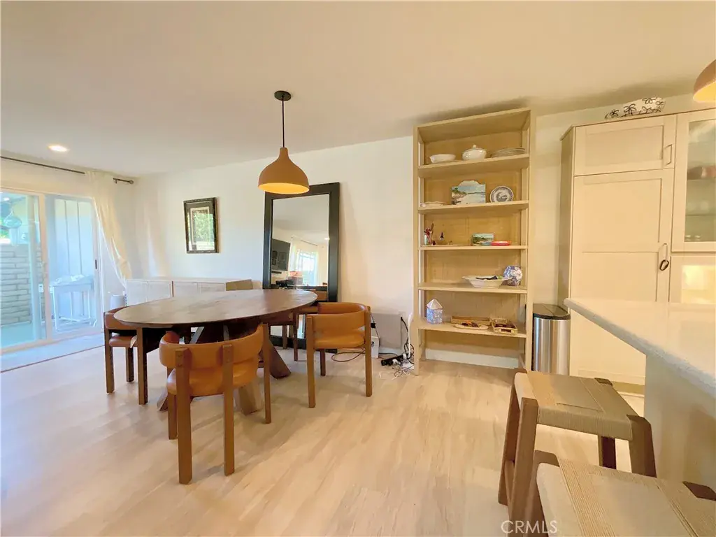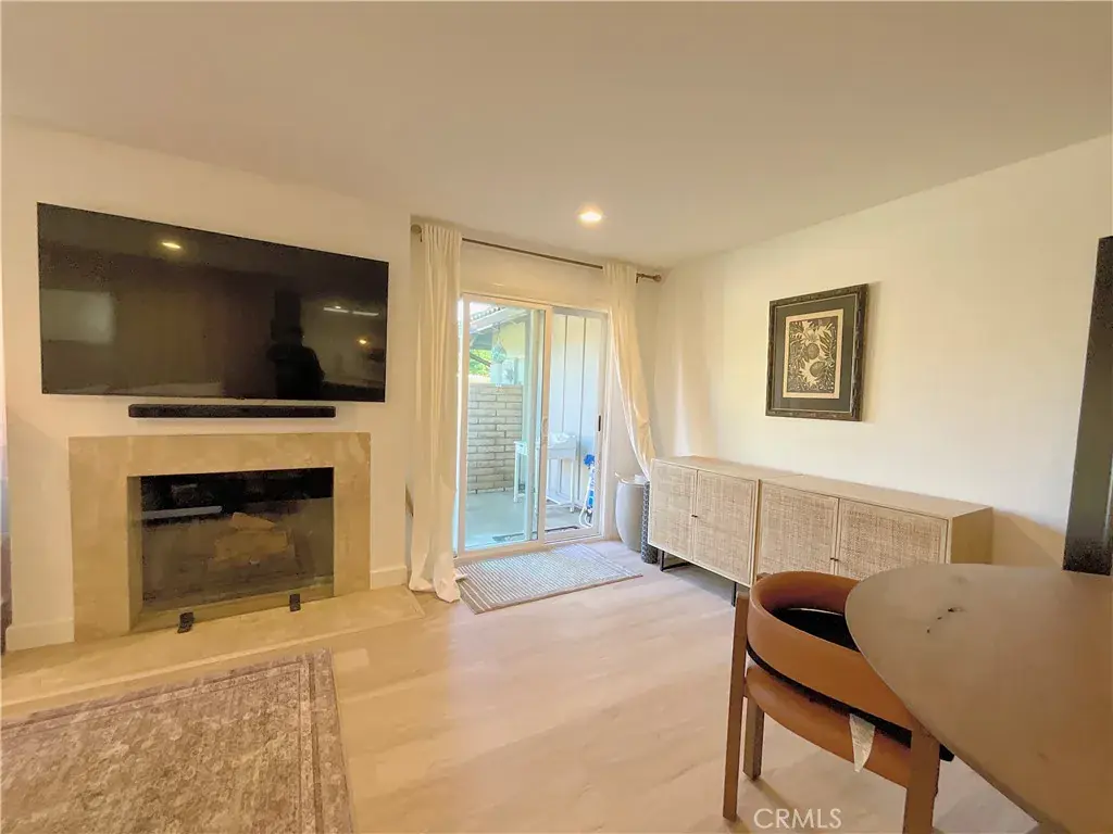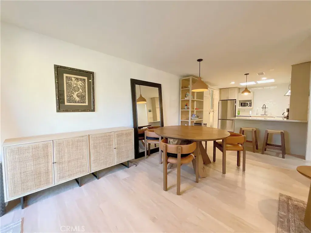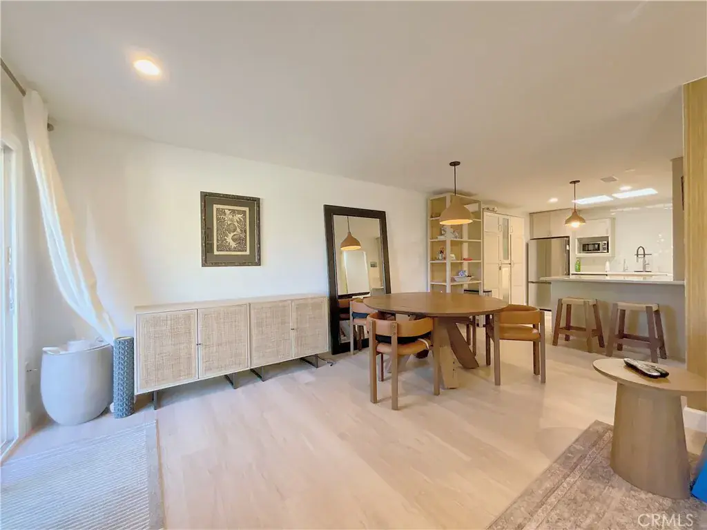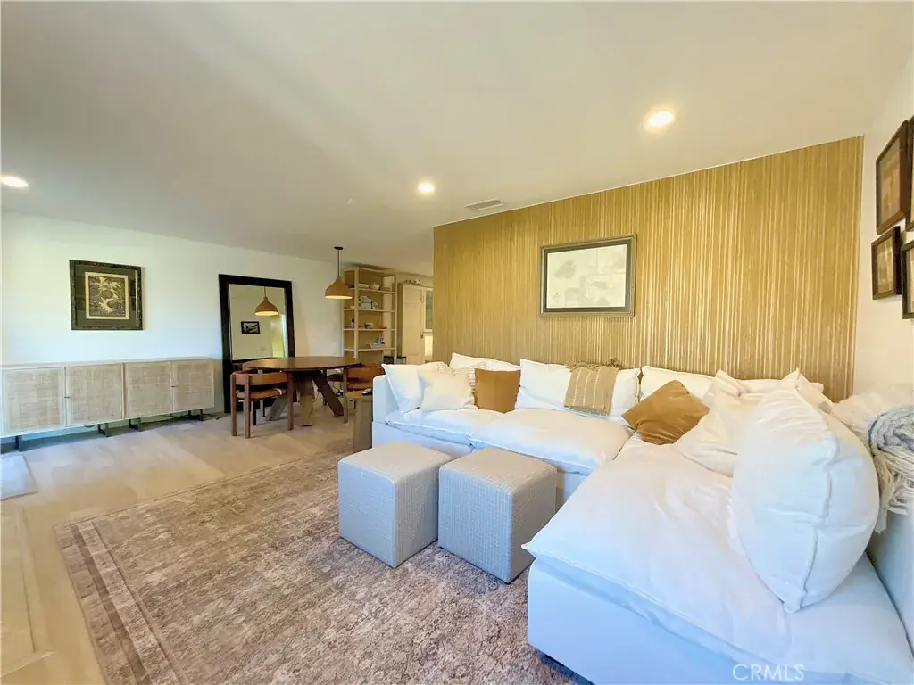 The open floor plan is highlighted by a bright living area, modern lighting, updated flooring, and seamless indoor/outdoor flow to the private courtyard—perfect for entertaining