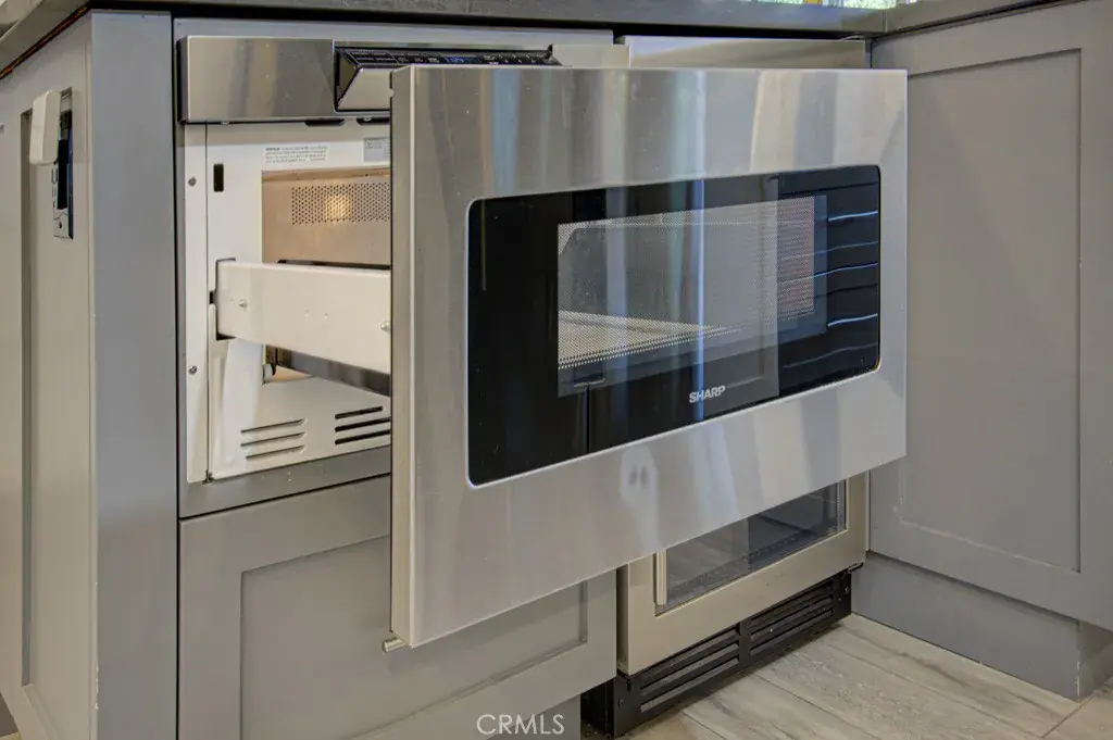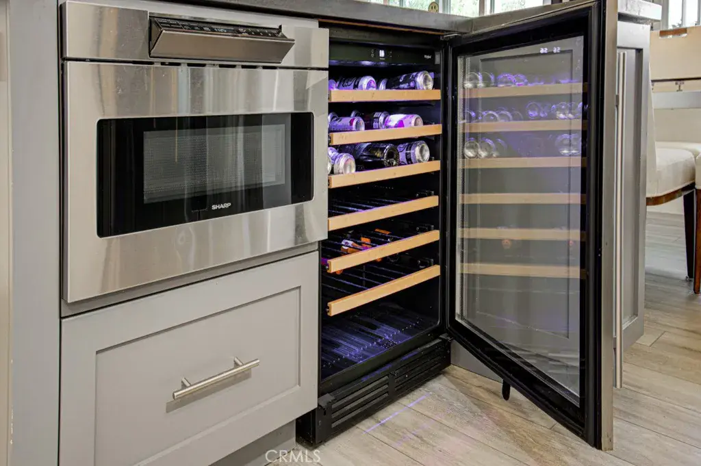 The designer kitchen is a true centerpiece, showcasing shaker cabinetry, quartz countertops, & a generous island with built-in microwave & wine refrigerator. High-end appliances include a Bosch dishwasher, induction range with exterior-vented chimney hood, and a Samsung four-door refrigerator featuring two convertible lower compartments that function as either refrigerator or freezer for ultimate flexibility. The dining area is enhanced by a custom built-in wall unit with accent lighting and abundant storage.