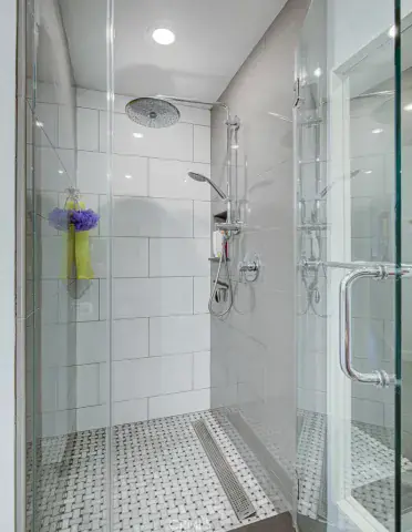 Spa-inspired bathrooms offer shaker vanities, quartz countertops, tiled flooring, and custom-tiled showers with frameless glass enclosures.