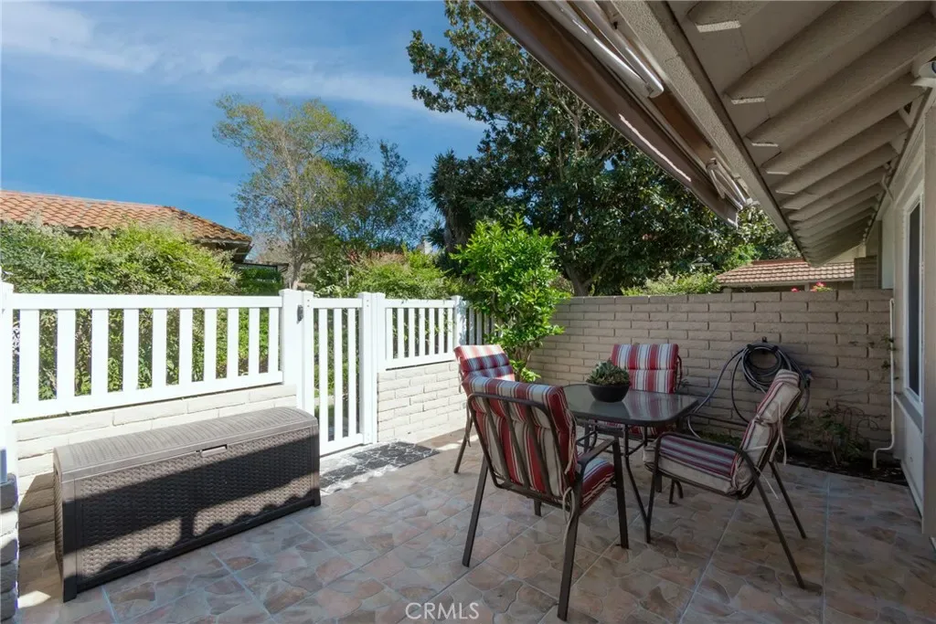 sliding glass door opens to the large patio with newer tile flooring & an awning for shade. Relax & enjoy entertaining & relaxing. This is an end unit with none above or below. Central Air Conditioning & full sized wash dryer closet. Laguna Woods offers a 27 hole golf course with a beautiful restaurant to enjoy! Driving range, tennis courts, pickleball courts, volleyball, 2 fitness centers, lawn bowling, equestrian center, library, state of the art theater, 5 pools & over 200 clubs! hurry, this one won’t last
