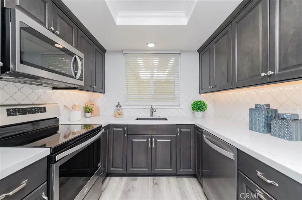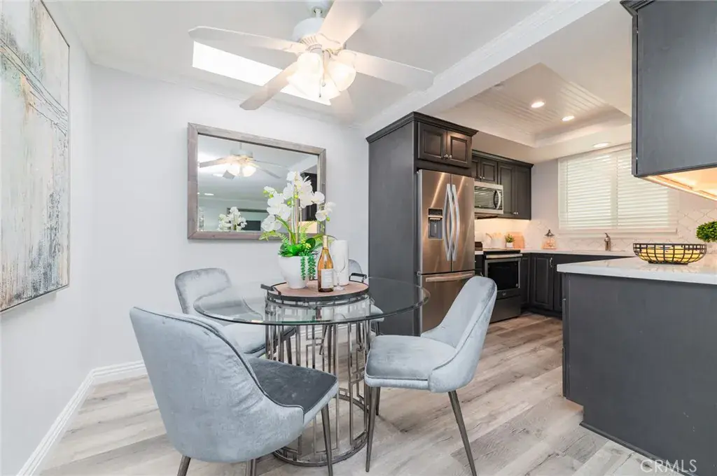 The gourmet kitchen showcases custom cabinetry, stunning quartz countertops, recessed lighting, and stainless-steel appliances, flowing effortlessly into an intimate dining area illuminated by a skylight.