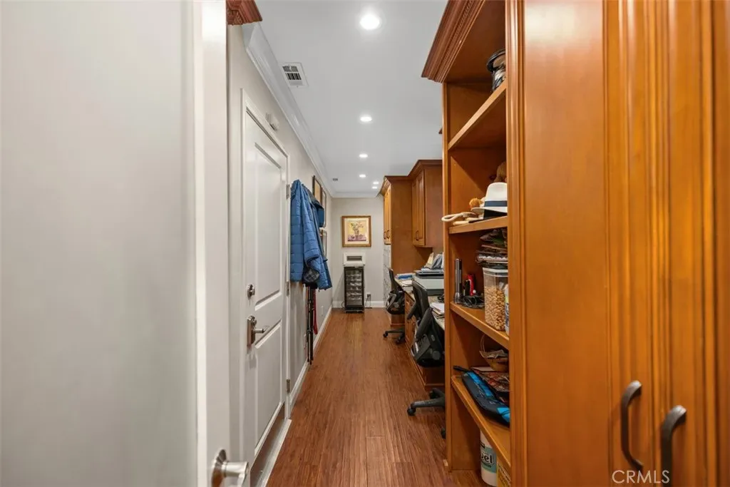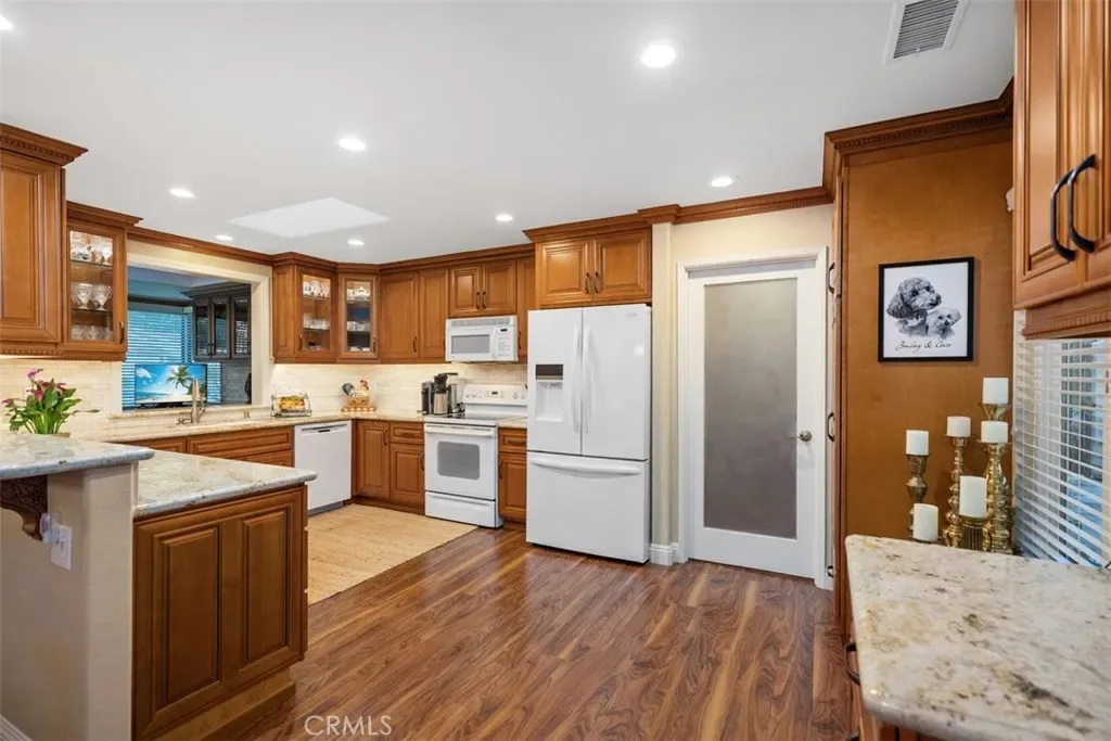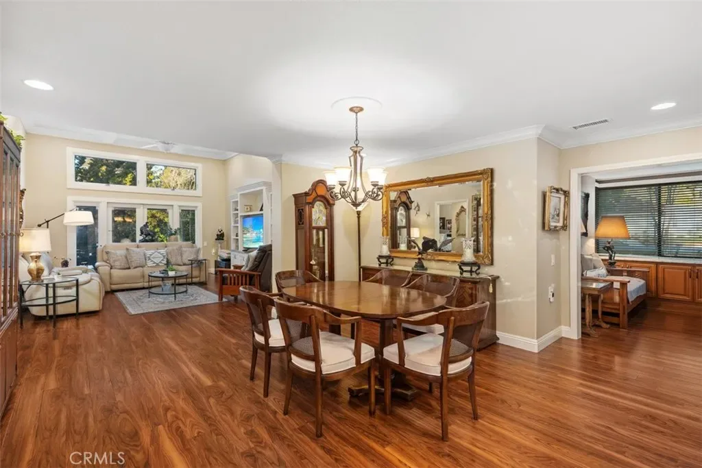 Throughout the home, exquisite details include laminated wood flooring, crown molding, recessed lighting, and upgraded doors and windows. The expansive sunroom—an inviting retreat with views of the neighborhood—is perfect for morning coffee, game nights, or quiet reading. A dedicated office space off the kitchen offers courtyard views and doubles as a flexible workspace.
