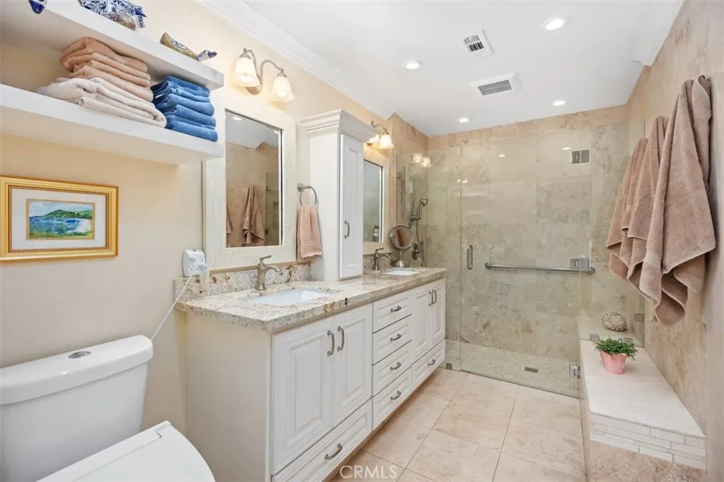 Boasting over 1,700 square feet plus a sunroom of more than 200 square feet, this residence features two spacious primary suites, each with fully remodeled bathrooms showcasing dual vanities, walk-in showers and custom closets. The open-concept kitchen is designed for entertaining, flowing seamlessly into a bright and airy living room accented by coffered ceilings and newly added transom windows that bathe the space in natural light.