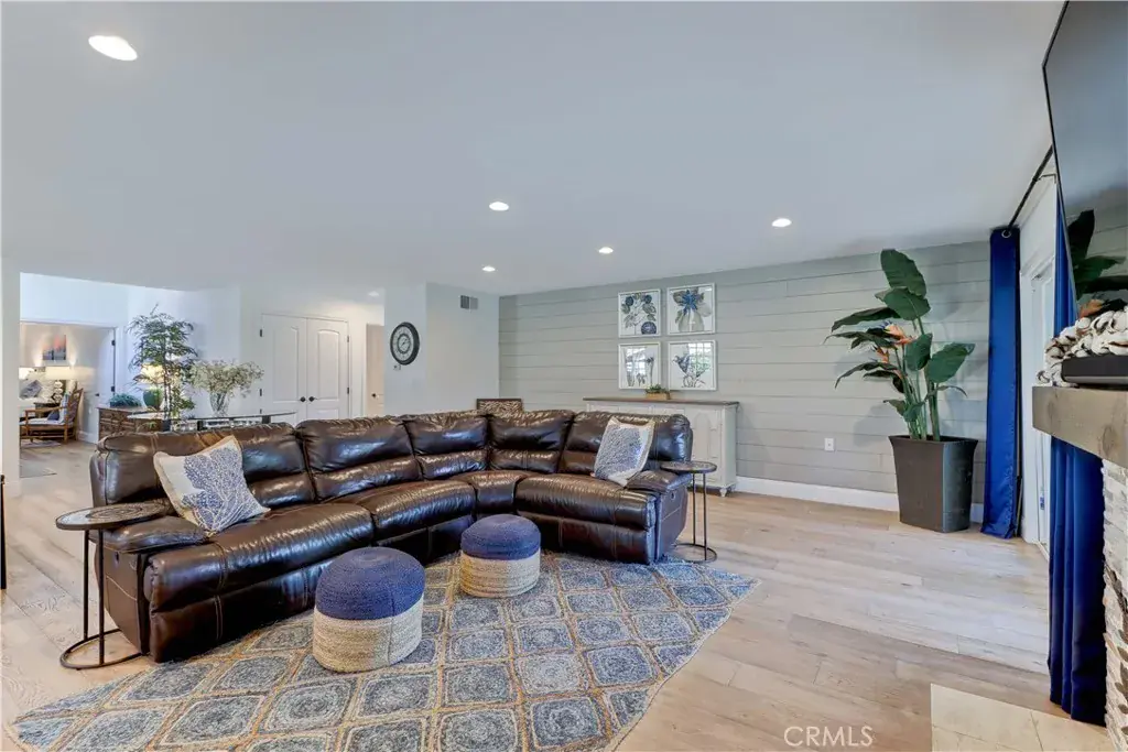A rare opportunity in one of the most sought-after locations in Laguna Woods Village. This beautifully remodeled 3-bedroom, 2-bath Casa Grande offers approximately 1,900 square feet of warm, sophisticated single-level living with an attached 2-car garage. From the moment you enter, an inviting open-concept great room anchored by a stone-lined fireplace sets the tone for relaxed elegance and effortless entertaining. The remodeled kitchen truly feels like the heart of the home, showcasing a generous island with seating, sleek stainless steel appliances, recessed lighting, and abundant cabinetry that flows seamlessly into the dining and living areas, all enhanced by rich wood flooring.