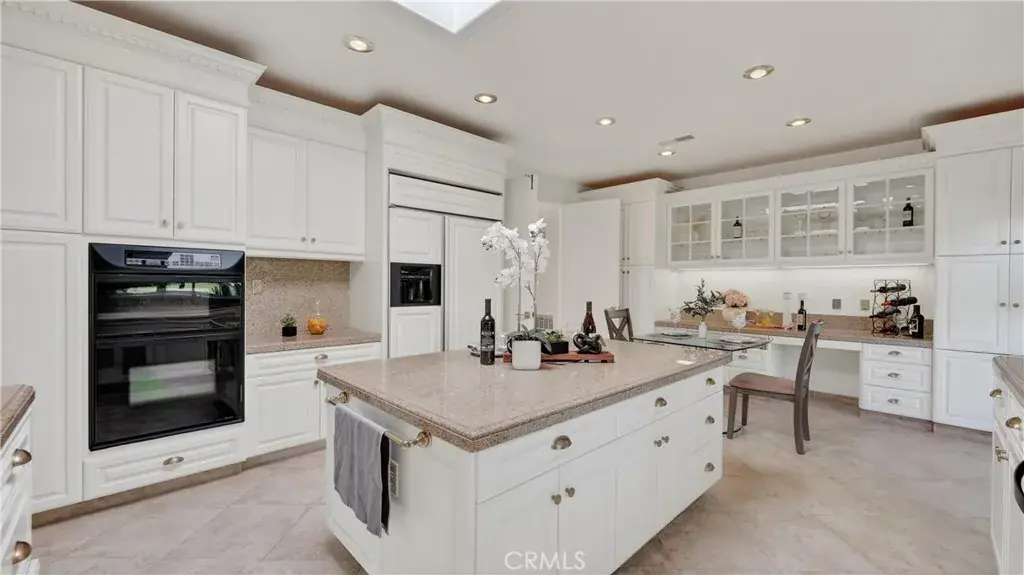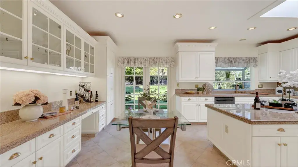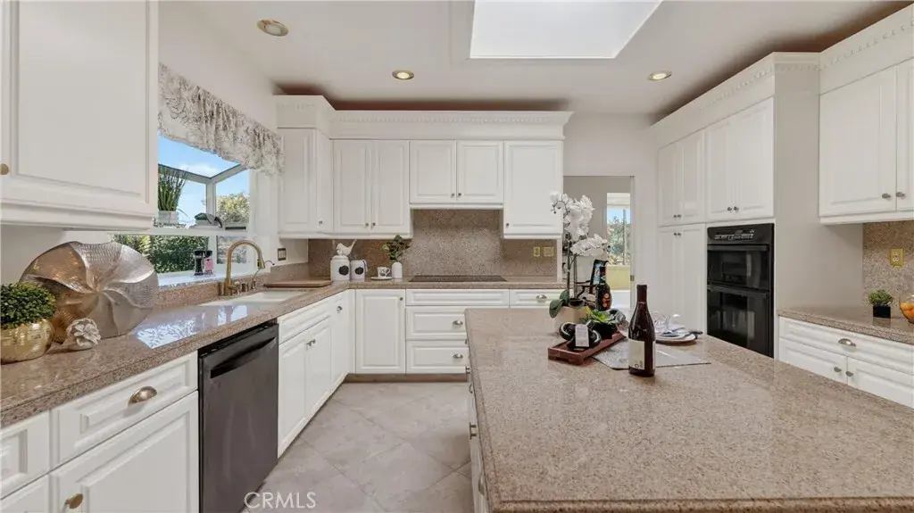 The kitchen is thoughtfully designed with freshly painted custom cabinetry, granite countertops, and a center island, offering ample storage and workspace. Views of the surrounding greenbelt enhance the kitchen environment and contribute to the home’s overall sense of openness.