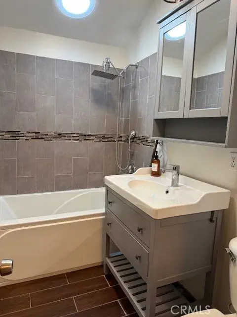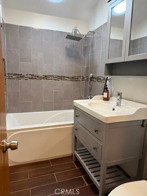 The beautifully remodeled kitchen boasts quartz countertops and backsplash, recessed lighting, and ample cabinetry. The primary bedroom includes a private, fully remodeled bathroom, while laminate and tile flooring run throughout the home. The updated secondary bathroom features a relaxing jacuzzi tub.