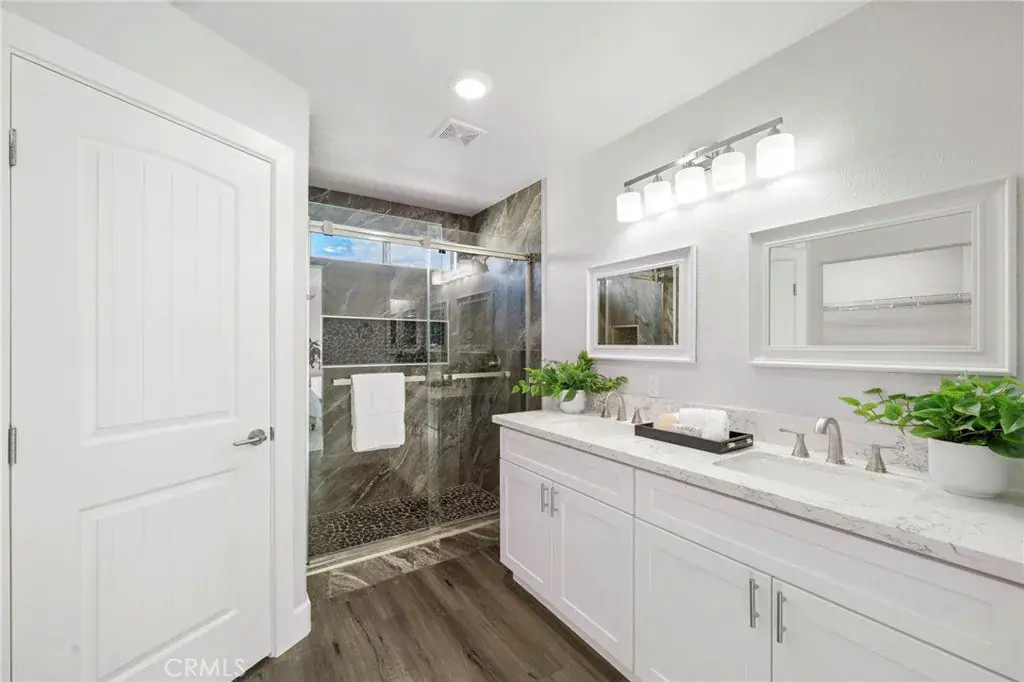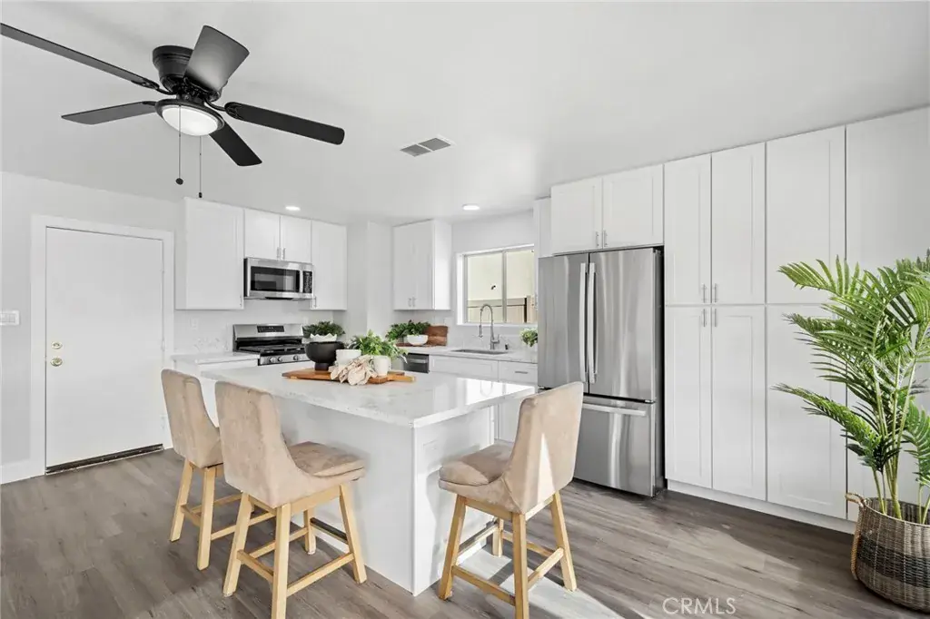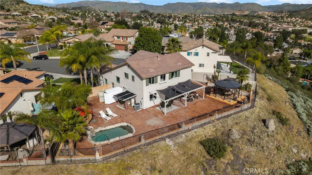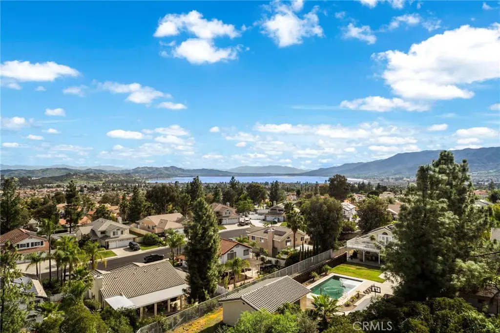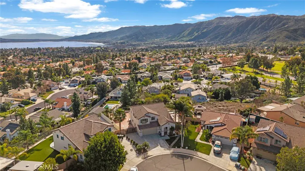 Welcome to 15294 Madrone Drive, an exceptional residence offering an absolutely breathtaking 220-degree panoramic lake view—arguably the finest in North Lake Elsinore’s highly sought-after Shore Pointe community. This beautifully upgraded two-story home features 4 bedrooms and 3 bathrooms, with a flexible downstairs space ideal for a potential 5th bedroom, media room, or guest suite. All four bedrooms are located upstairs, creating a thoughtful separation of living and private spaces. The interior has been completely upgraded, highlighted by a brand-new kitchen with shaker cabinets adorned with freshly installed quartz countertops, and finished with upgrades stainless steel appliances. From the kitchen island, the great room opens seamlessly, connecting the dining area and family room to create the perfect for both everyday living and entertaining. A custom entertainment niche and expansive windows throughout the home capture stunning lake views from most rooms. All three bathrooms have been completely renovated as well, bringing new life and style into this home. Step outside to a truly resort-style backyard designed for entertaining and relaxation. Enjoy a relaxing dip in the in-ground hot tub featuring a beach-style entry and cascading waterfall, or sweat out the stress in the adjacent sauna. A gazebo with built-in heaters create the perfect setting for evenings spent unwinding while taking in unforgettable sunsets over the lake. The entire backyard is finished with stamped and stained concrete, offering a cohesive and low-maintenance outdoor space—all with panoramic lake views as the backdrop. Additional highlights include RV access and parking with elegant wrought-iron gates, as well as a prime location within walking distance to McVicker Park. Conveniently close to schools, churches, shopping, and dining, with easy access to the I-15 freeway and Ortega Highway, connecting the lake community to the beach community. Panoramic lake views of this magnitude are seldom available, positioning this home as one of Shore Pointe’s most desirable offerings.