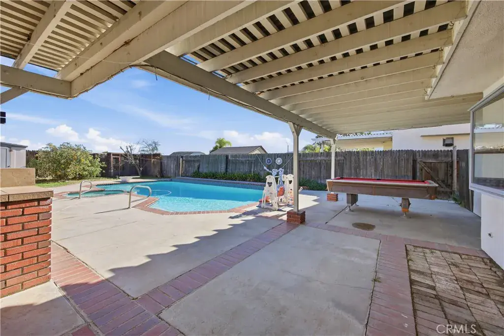 Strategically designed 1 bedroom & 1 full bathroom with double doors on the first floor, perfect for guests or a home office. The ample sized primary suite provides views of the lush backyard- Private Pool & Mountain view! The open floor plan boasts vaulted ceilings throughout the living and dining area. The spacious family room, complete with fireplace, flows seamlessly into a generously sized area, ideal for family gatherings. Walk through the sliding glass door from the family room, you are greeted by a very large sized covered patio structure with ceiling fan, a sparkling pool, BBQ area with sink to entertain large crowd on the weekends and to enjoy pool party on summer days with outdoor misting system to cool the entire patio area.