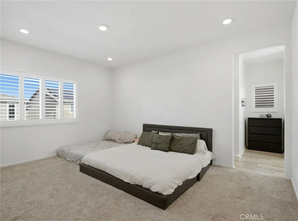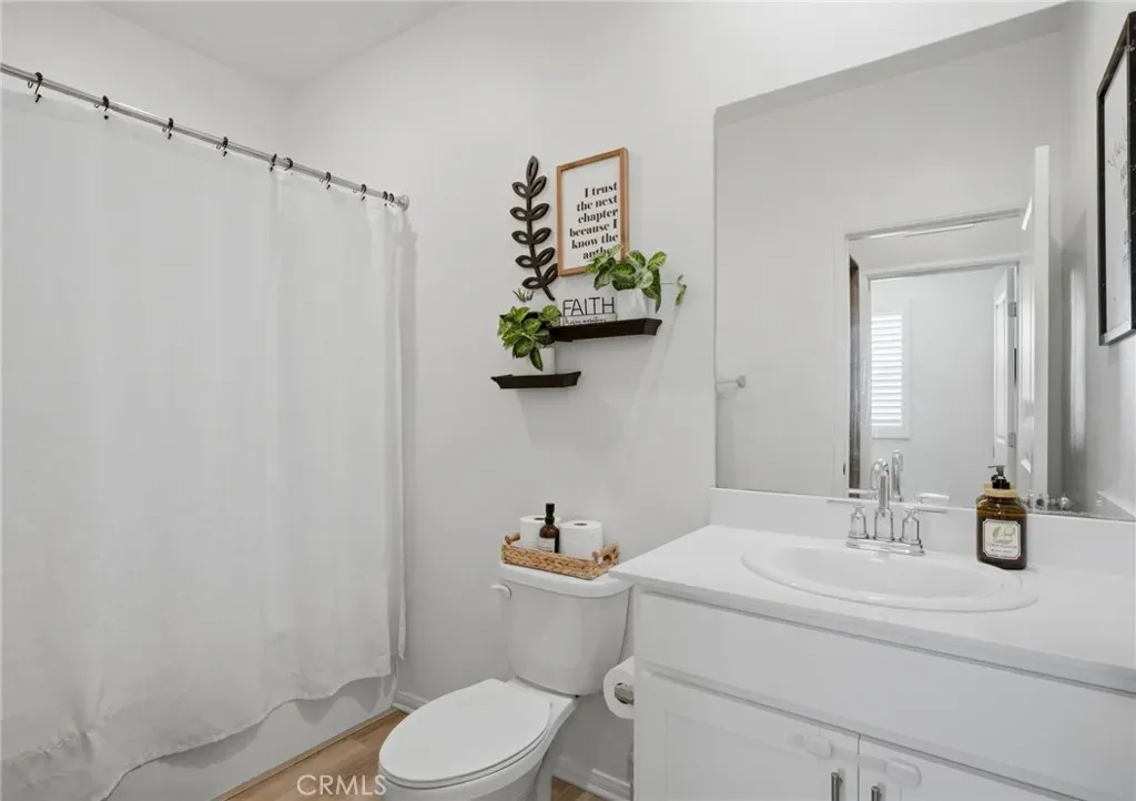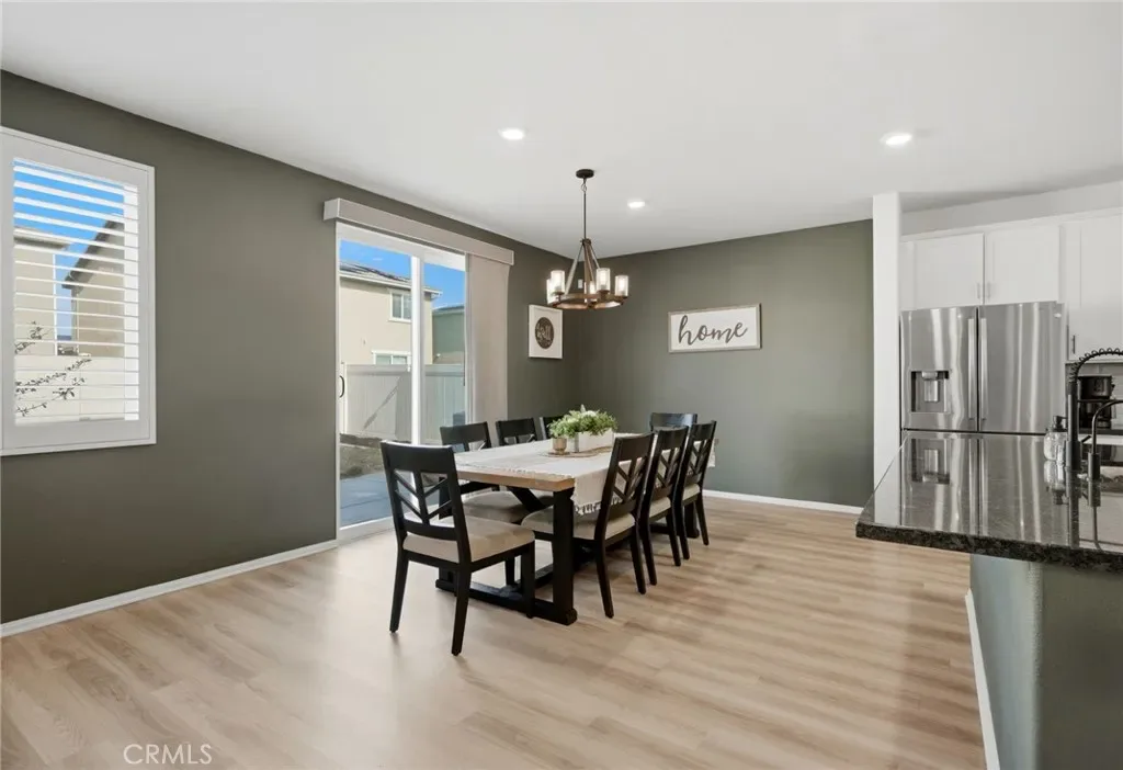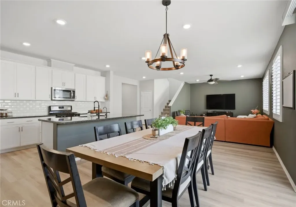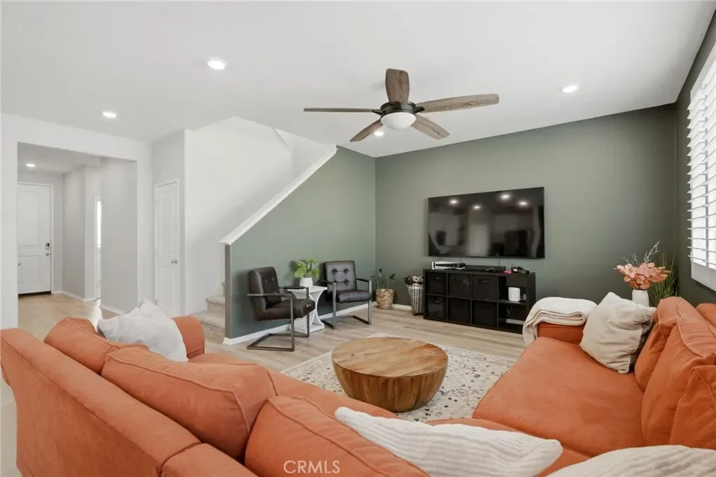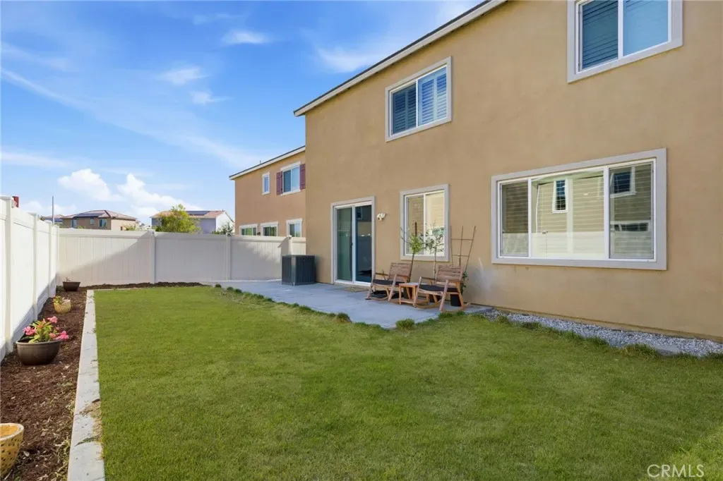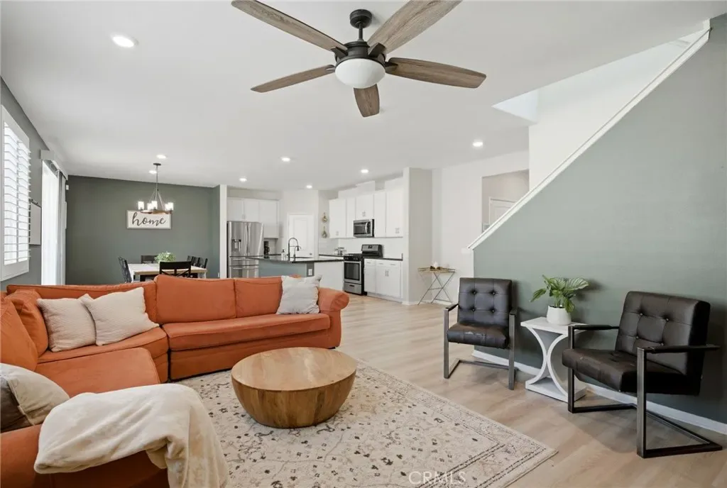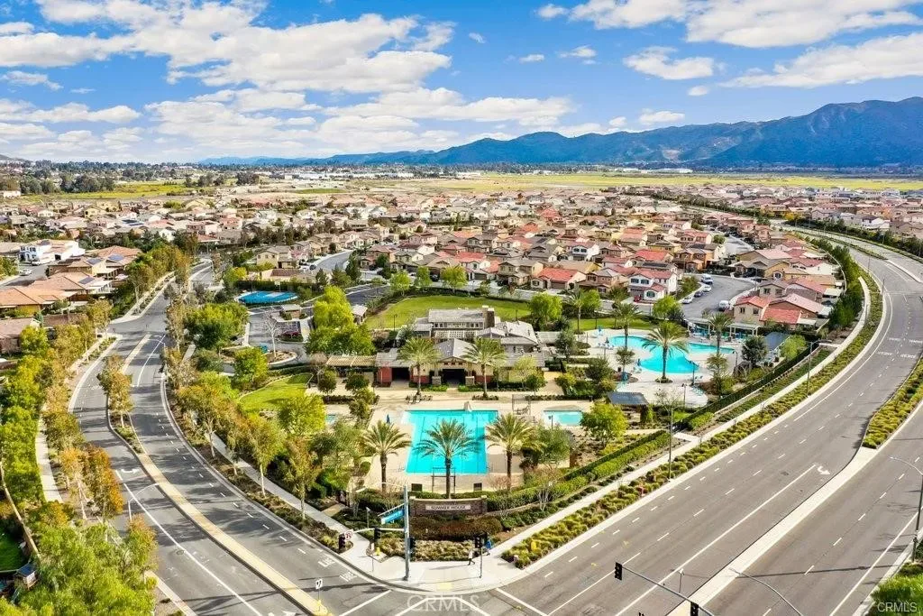 Turn-Key Summerly Home with PAID OFF SOLAR! Beautifully upgraded 4 bedroom, 3 bathroom Meritage home featuring abundant natural light, recessed lighting with dimmers, plantation shutters, a tankless water heater, and paid off RainSoft water softener system. The backyard includes a large patio for entertaining and the low maintenance front yard includes artificial turf. The stylish kitchen features white cabinetry, stainless farmhouse-style pulls, white subway tile backsplash, black granite countertops, stainless steel appliances, a walk-in pantry, and a large island with seating for four. The open layout flows into the dining area and living room with ceiling fan. Upgraded waterproof LVP flooring downstairs and neutral carpet upstairs complement any décor. A downstairs bedroom with easily accessible bath is perfect for guests or multigenerational living. Upstairs includes a laundry room with built-in shelving, two secondary bedrooms, and a spacious primary suite with a versatile nook, oversized walk-in shower, dual sinks, private toilet room, and large walk-in closet. The garage offers overhead storage. Residents of the Summerly community in Lake Elsinore enjoy resort-style amenities including pools, splash pad, sports fields, parks, trails, and nearby Lake Elsinore Diamond Stadium. Conveniently located minutes from the Interstate 15, Lake Elsinore, shopping, dining, and everyday essentials.