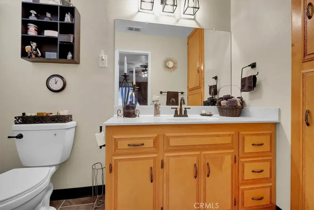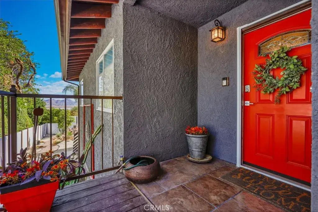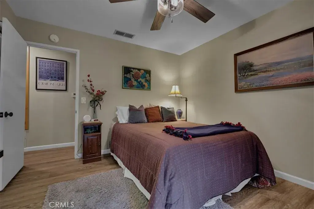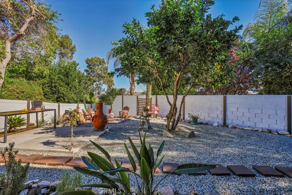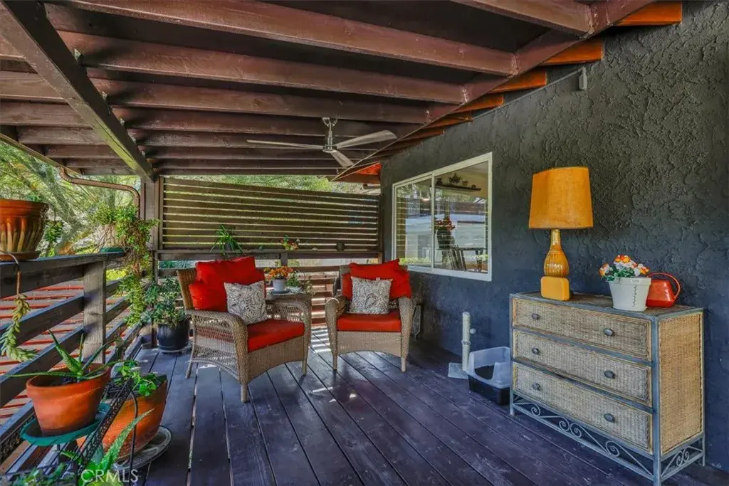 Tucked along a quiet incline in Lake Elsinore, this charming single-level home combines comfort, privacy, and beautiful outdoor living. A private walkway of dark wood leads to a tiled front porch and vibrant orange door, setting a welcoming tone. Inside, the home features cohesive ceilings with recessed lighting and wood-style flooring that extends throughout the main areas. The layout opens to a bright living and formal dining area, flowing into a spacious kitchen with an additional dining nook and sliding doors leading to the deck. A central hallway offers convenient access to the laundry area, two secondary bedrooms (one with garage access), a full bathroom, and the primary suite with an ensuite bathroom. Each bedroom includes ceiling fans and natural light. The true highlight of the home is its expansive, covered deck, crafted with rich dark wood, a ceiling fan, and serene views of the landscaped yard below. The backyard feels like a private retreat, featuring tiered spaces with stone and gravel pathways, lush greenery, and a spa tucked beneath the deck. The property also includes a two-car garage and a decorative stone perimeter fence, completing its inviting curb appeal.