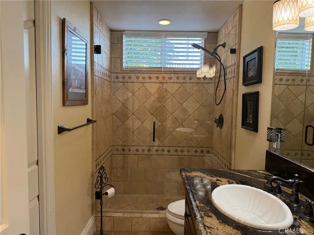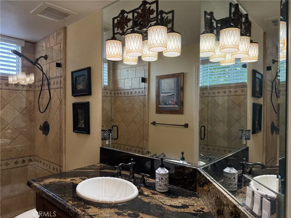 The primary suite is a true retreat with a stand-alone jetted tub and travertine shower. The his-and-hers walk-in closets are a showstopper — complete with custom cabinetry, Quartzite island, and a hidden door/bookcase — truly a million-dollar feature!