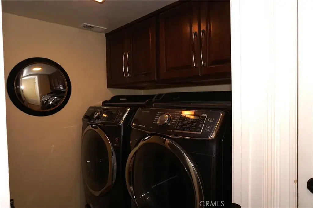 Features include travertine flooring, soft-close cabinetry, granite counters, custom interior doors, and upgraded lighting with dimmers. The chef’s kitchen offers upgraded cabinets and appliances, a quiet disposal with countertop button, and a trash compactor.