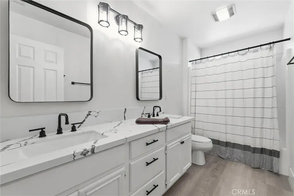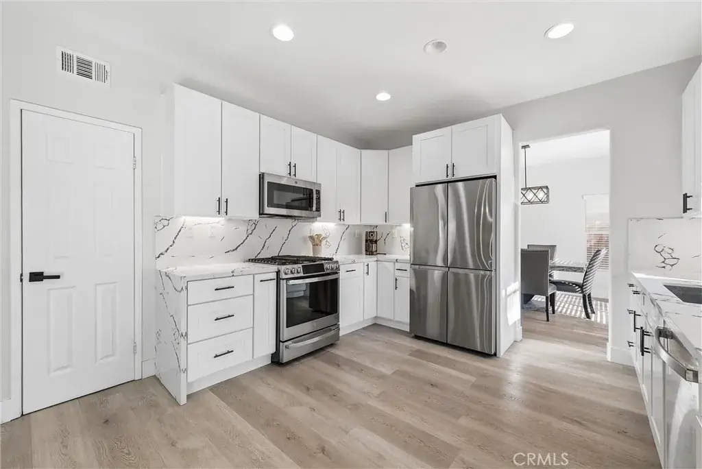 Inside, you’ll find newer 9” luxury vinyl plank flooring throughout and a fully remodeled kitchen featuring quartz countertops, soft-close cabinetry, a smart-enabled range, newer microwave, and newer dishwasher. The home also offers newer light fixtures, ceiling fans, faucets, blinds, and roller shades throughout, with motorized remote-controlled shades in the living room and primary bathroom.