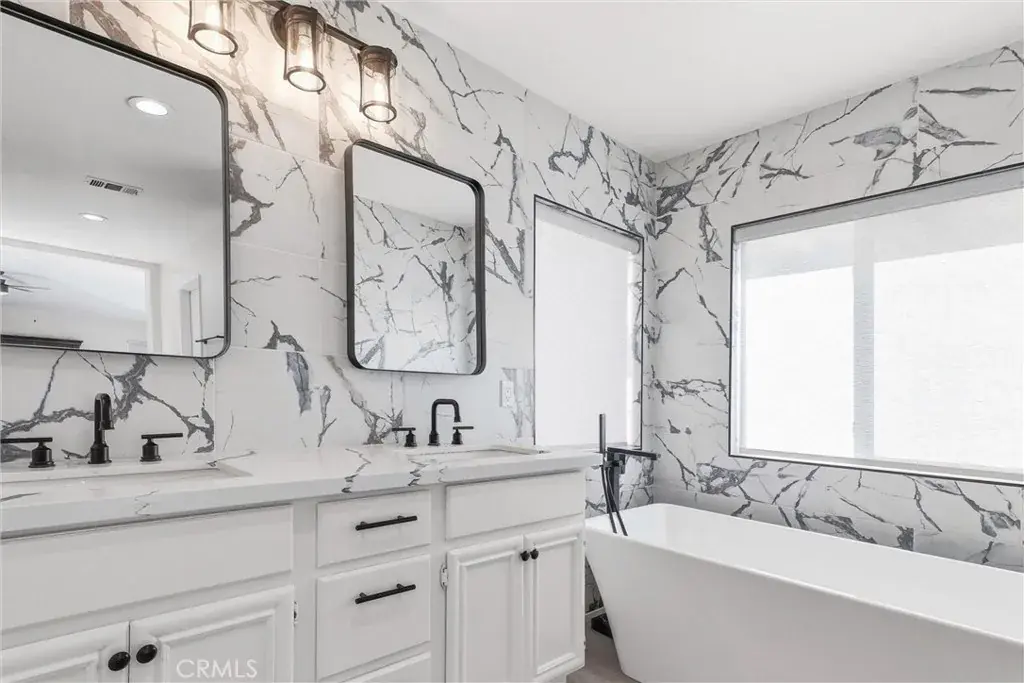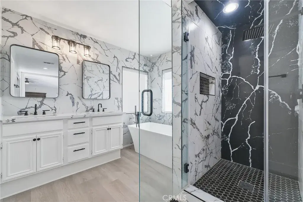 The spacious primary suite includes a private balcony and a beautifully updated bathroom with a large walk-in shower, freestanding soaking tub, dual sinks, and quartz countertops.