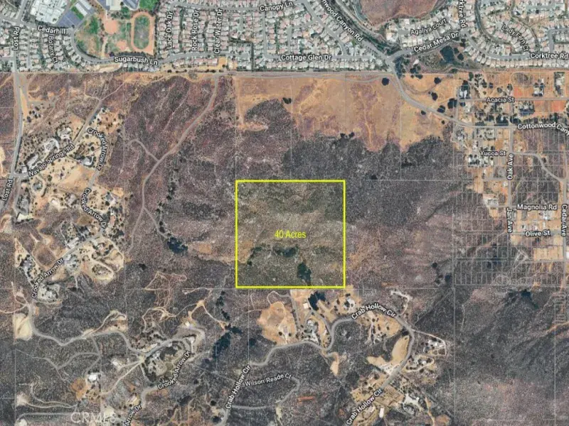 Views for miles—Fantastic opportunity to own and develop this private parcel of land into a hilltop estate with majestic views all around. Vacant land with utilities nearby with panoramic views of the neighbors below and surrounding mountains. 40 acre parcel located off of Turtle Creek Rd and Crab Hallow Circle. Several potential homesite pads that allow you to have privacy and views. Zoned RA1. Residential agriculture 1- typically requires a minimum one-acre lot size, blending rural living with limited residential and agricultural uses, allowing single-family homes, some farming, and accessory structures, while promoting orderly growth and preserving open space. Peaceful, elevated setting within a few minutes of desired amenities– shopping, schools, medical. Per Elsinore Valley Municipal Water District website, the property does not have access to nearby sewer so septic system would be necessary but there appears to be water access on Crab Hollow Circle. Imagine the possibilities of creating your own hilltop estate!!