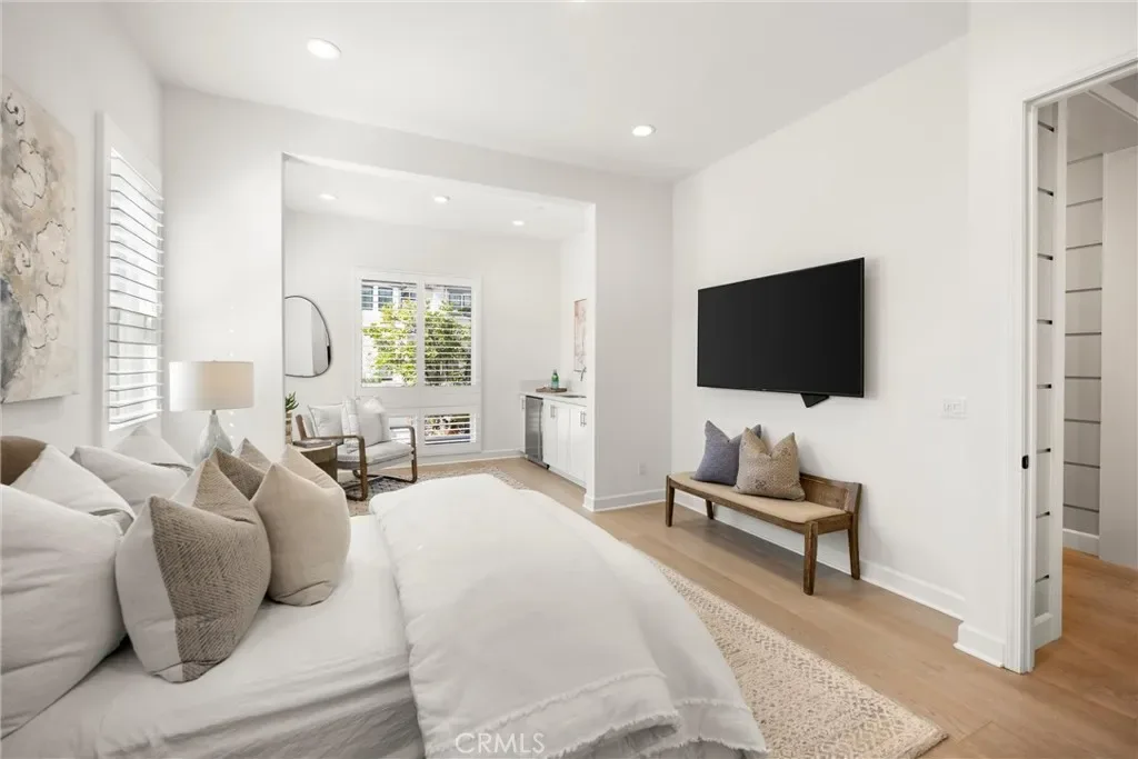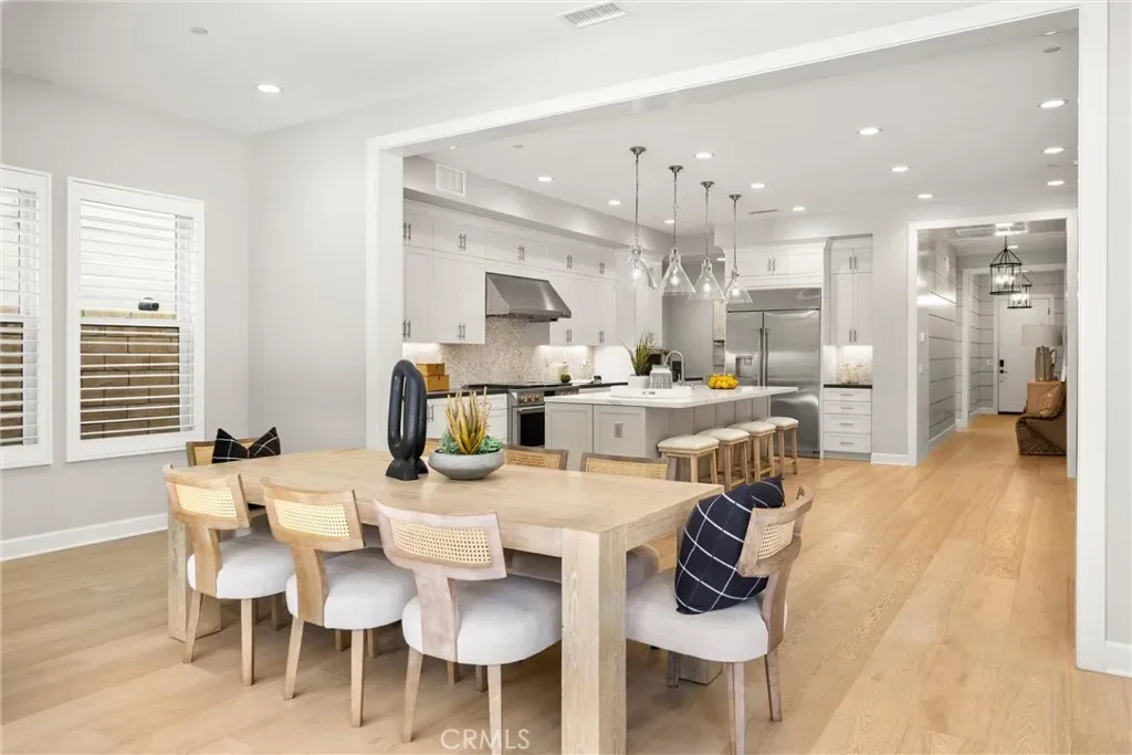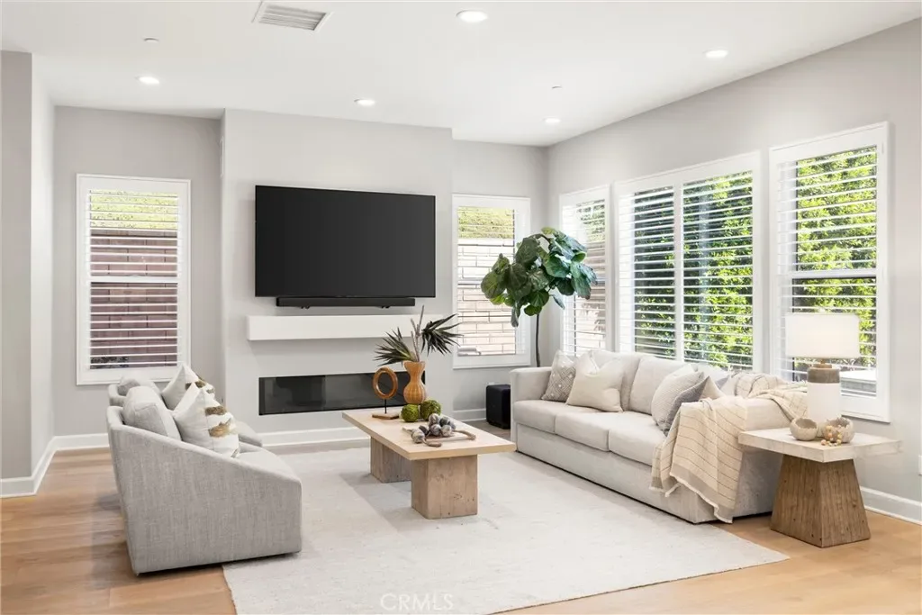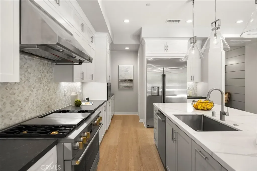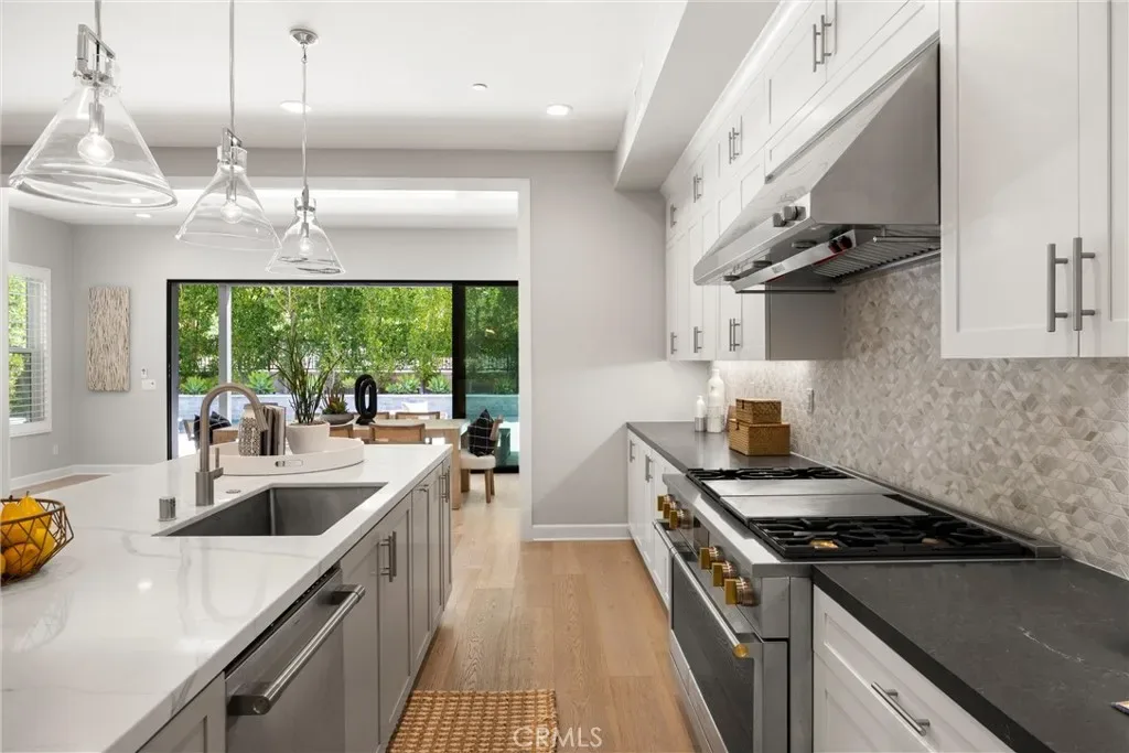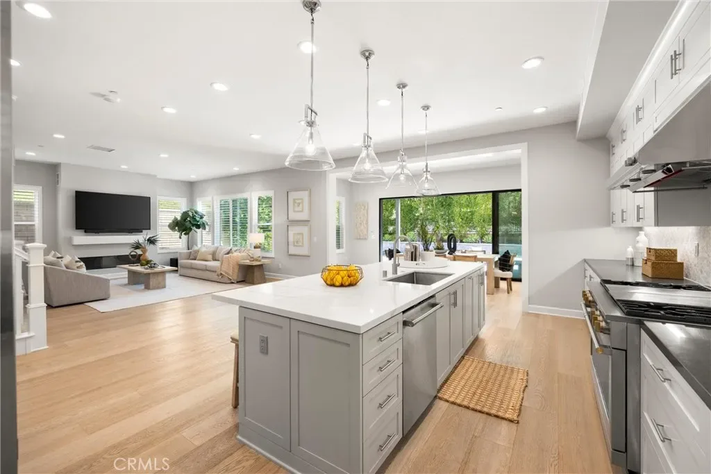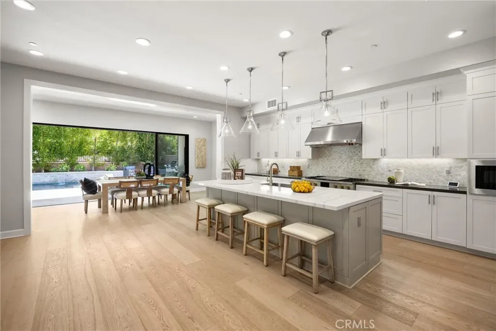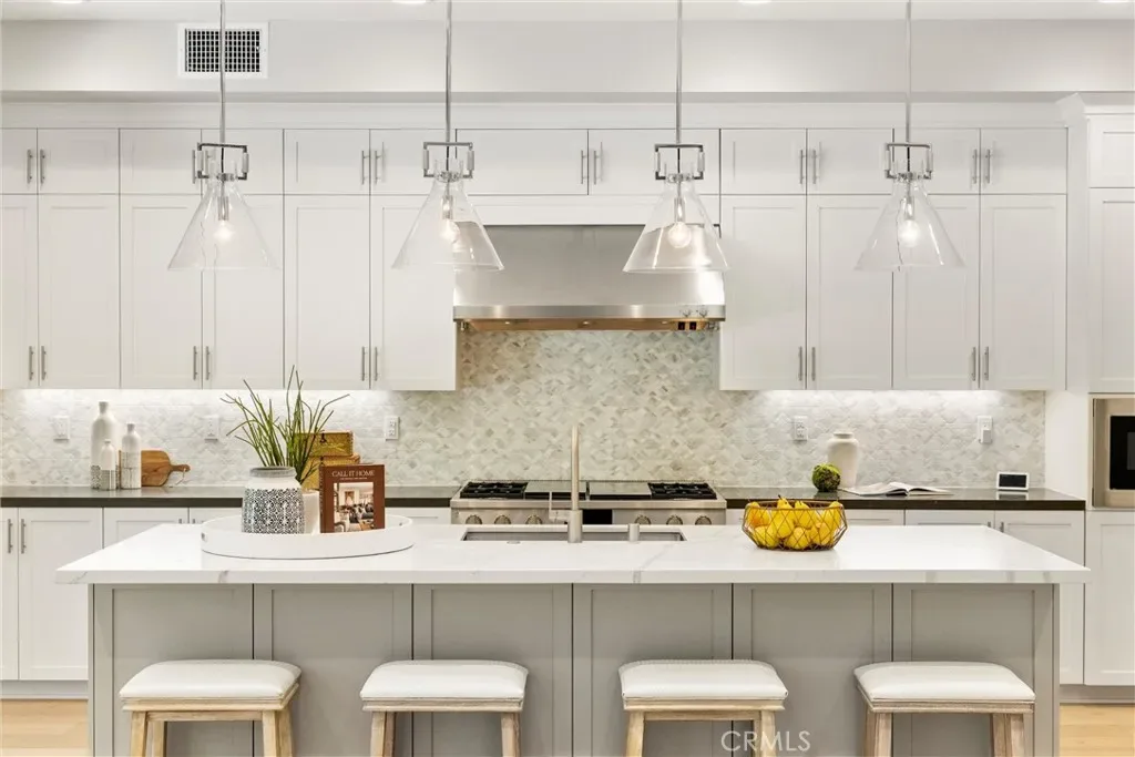 Light streams into the home through plantation shutters and glass sliding doors. The bright and airy open-concept living space features hardwood flooring, and a living room with a modern fireplace that flows into the kitchen. Restoration Hardware pendant lights dangle on top of the vast island. The dream kitchen features a full Pietra Divina Calacatta Mosaic backsplash, and stunning Shaker style cabinets that reach up to the ceiling. The countertops extend into the pantry corridor for the perfect beverage nook.