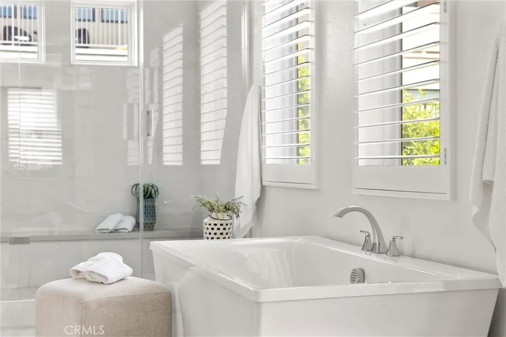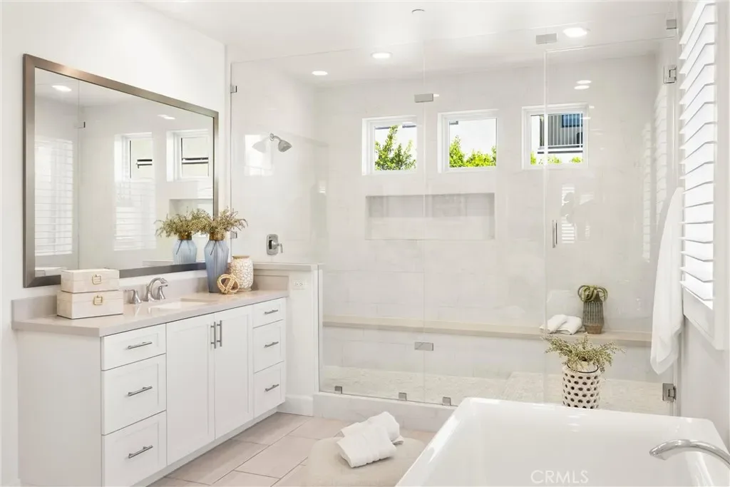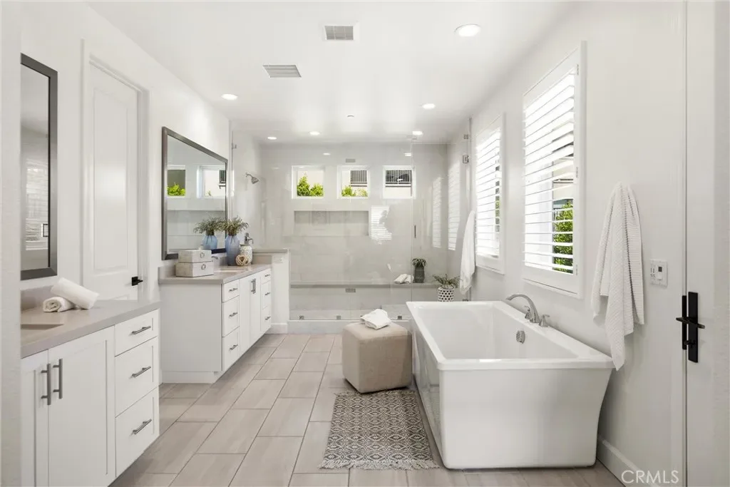 Upstairs includes additional bedrooms, versatile loft space, convenient laundry room, and a beautifully appointed primary suite. The spa-like primary bath features a frameless glass walk-in shower with a dry-off area, a soaking tub, walk-in closet, and dual vanities.