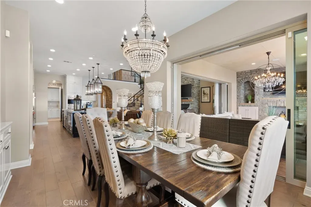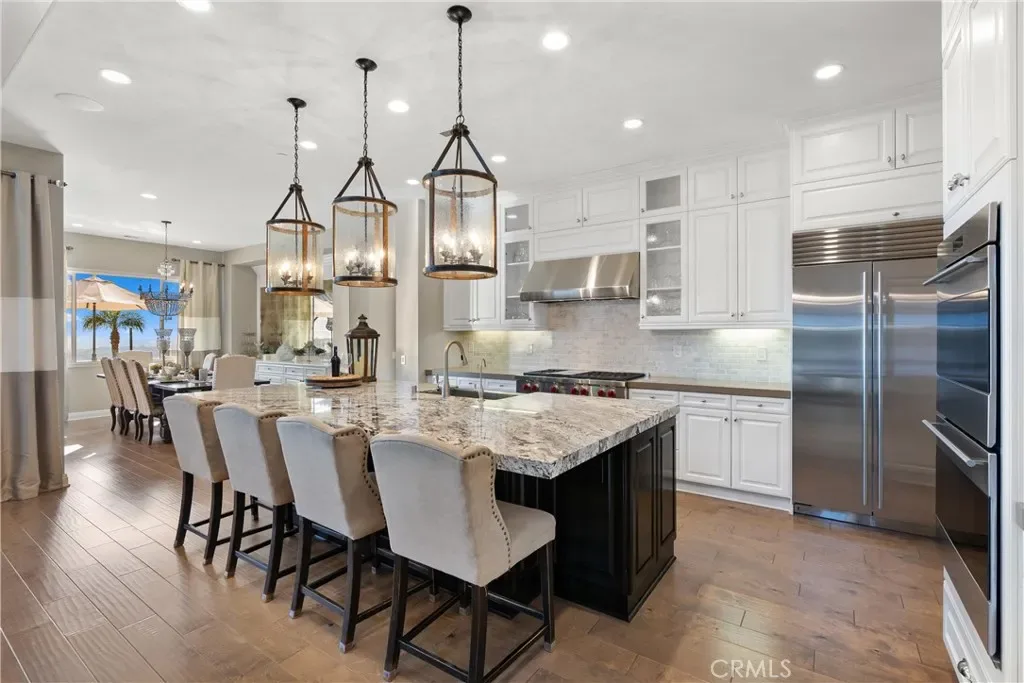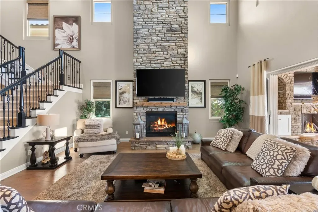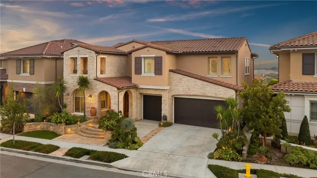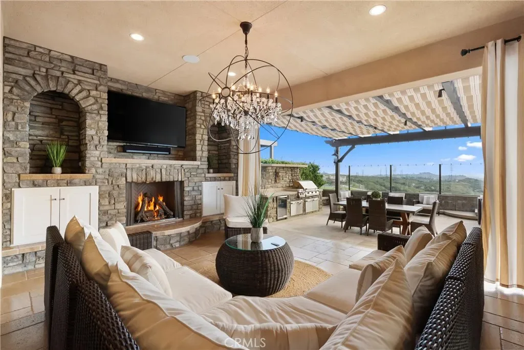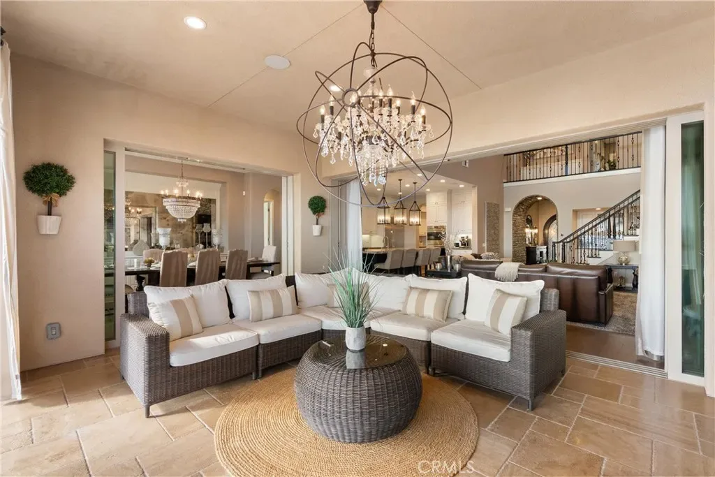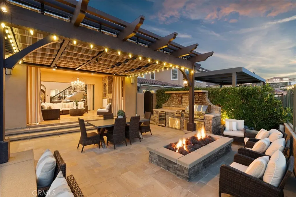 Breathtaking backyard views await within the prestigious gated community of The Oaks at Portola Hills. This exceptional residence masterfully blends luxury and comfort, offering a spacious open-concept design, elevated finishes, and sweeping panoramic views that enhance everyday living. The expansive main level showcases soaring ceilings, custom lighting, and a luxurious primary suite featuring a custom millwork accent wall, spa-inspired bath with freestanding tub, dual vanities, an oversized walk-in closet, and private sliding doors leading to the pool and backyard retreat. A secondary en-suite bedroom and elegant powder room complete the main floor, ideal for guests or multigenerational living. Upstairs, you’ll find three spacious bedrooms, two baths, and a versatile loft perfect for work, study, or play. At the heart of the home, the chef’s kitchen impresses with Wolf and Sub-Zero appliances, a stunning Silver Lennon granite island, pull-out drawers, custom built-ins, and seamless flow into the main living area. Sliding glass doors open to the California Room, creating effortless indoor-outdoor living. Outside, a private resort-style backyard awaits with a custom pool, outdoor kitchen, and beautifully designed spaces for entertaining or relaxing. Thoughtful upgrades include solar panels, water softener, hardwood flooring, designer carpeting, plantation shutters, a stone-accented fireplace, upgraded staircase, flat-panel prewire, Cat 6 wiring, surround sound, satellite-ready package, prewire for charging station, custom framed mirrors, refined tile work, and the third car garage is set up as a home gym. Residents of The Oaks enjoy resort-inspired amenities including a pool, spa, clubhouse, BBQ areas, dog park, and scenic trails, all conveniently located near premier dining, shopping, and freeway access. This remarkable home truly captivates at every turn.