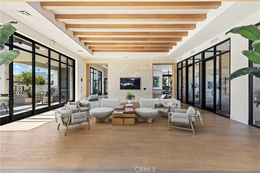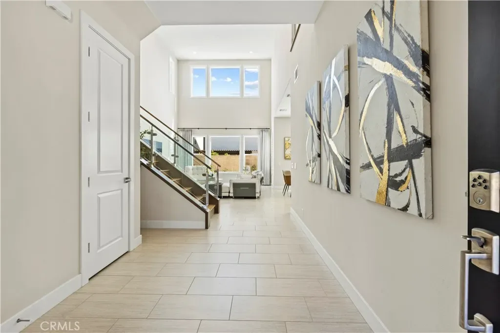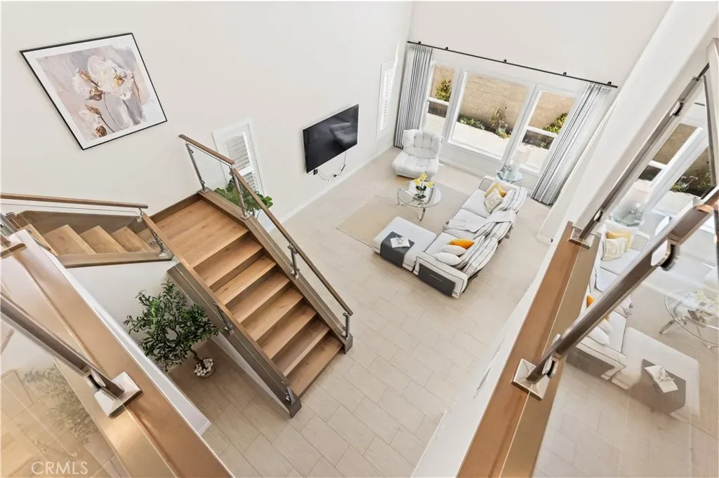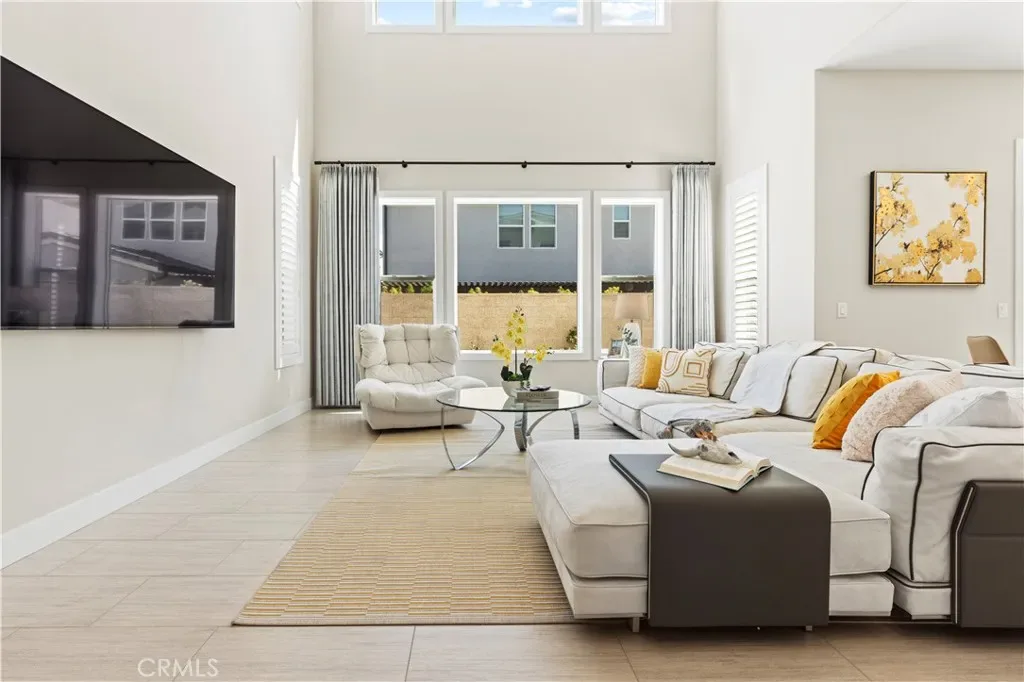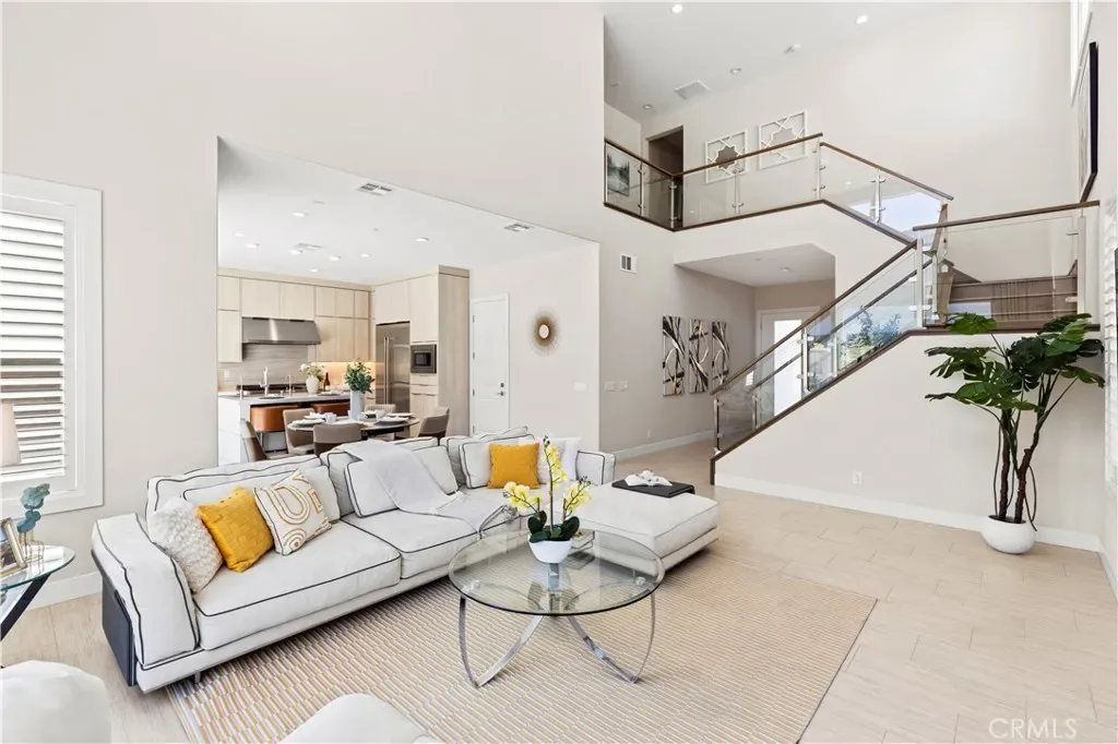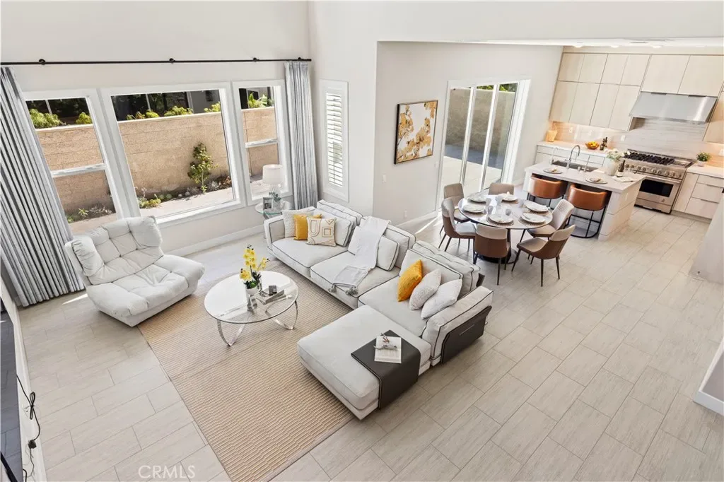 Step through the elegant entry into a soaring, light-filled living room. A dramatic two-story wall of windows floods the space with natural California sunshine, creating a bright, warm, and inviting atmosphere.