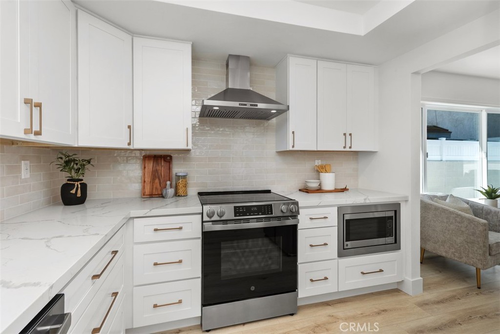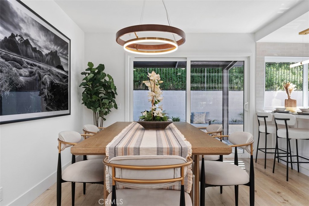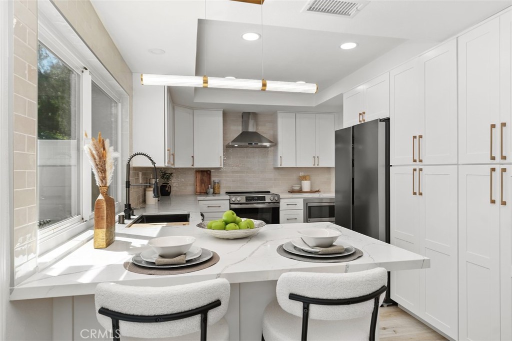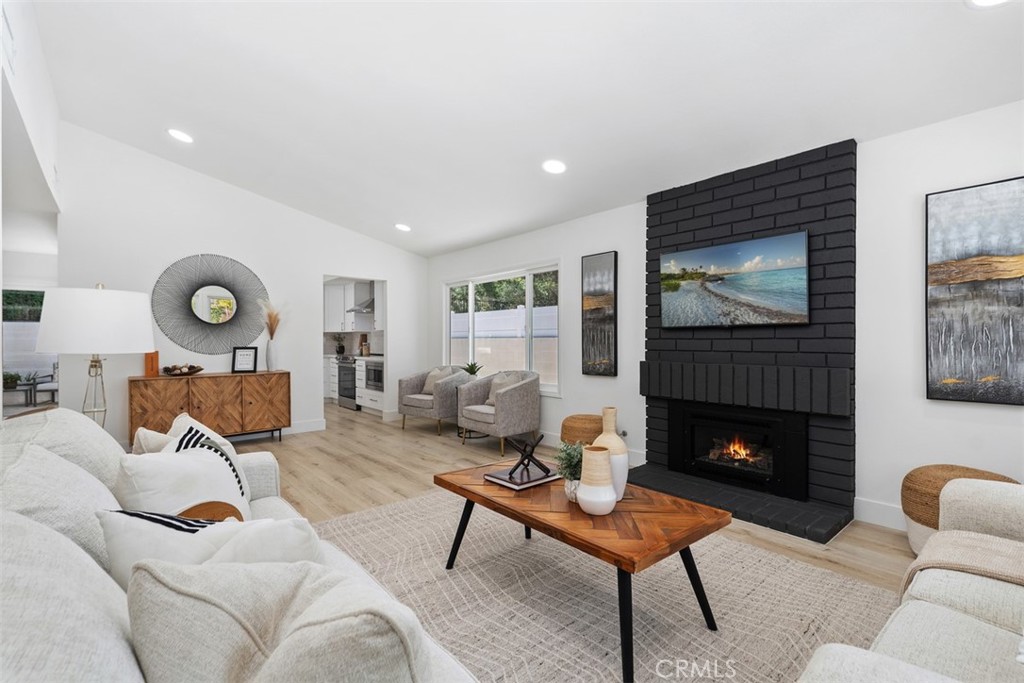 Welcome to 22322 Silent Brook, an exceptional single-story ranch-style residence in the coveted Creekside community, expertly reimagined with timeless sophistication, modern comfort, and true California indoor-outdoor living. This beautifully updated home offers approximately 1,500 square feet of living space, making it ideal as a starter home or for those seeking the ease of single-level living. Every inch of the property reflects quality craftsmanship and thoughtful design. The home features 3 bedrooms and 2 beautifully appointed bathrooms, anchored by an open-concept layout that seamlessly connects the living, dining, and kitchen areas. The upgraded kitchen showcases new soft-close cabinetry with brass hardware, Calcutta quartz countertops, designer lighting, stainless steel appliances, and a peninsula with bar seating – perfect for everyday living and entertaining. The family room offers a warm yet inviting atmosphere, highlighted by a cozy gas fireplace and vaulted ceilings that enhance the sense of space and natural light. The primary suite provides ample closet space and vaulted ceilings, creating an airy retreat, along with a spa-inspired bathroom complete with a walk-in shower, double-sink white oak vanity, and elegant lighting. Throughout the home, you’ll find wide-plank flooring, new baseboards, recessed lighting, fresh interior paint, and numerous additional upgrades. Step outside to a private backyard designed for both relaxation and entertaining, featuring hardscape, a covered patio, and a dedicated planter area. Additional highlights include a new A/C system with smart thermostat, epoxy-coated garage floor, smart video doorbell, and fresh landscaping on an automatic drip system. Ideally located on a quiet street just steps from Pebble Creek Park, this home also offers low property taxes, no HOA, and no Mello-Roos. A rare opportunity to own a fully remodeled, move-in-ready single-story home of this caliber, don’t miss it!