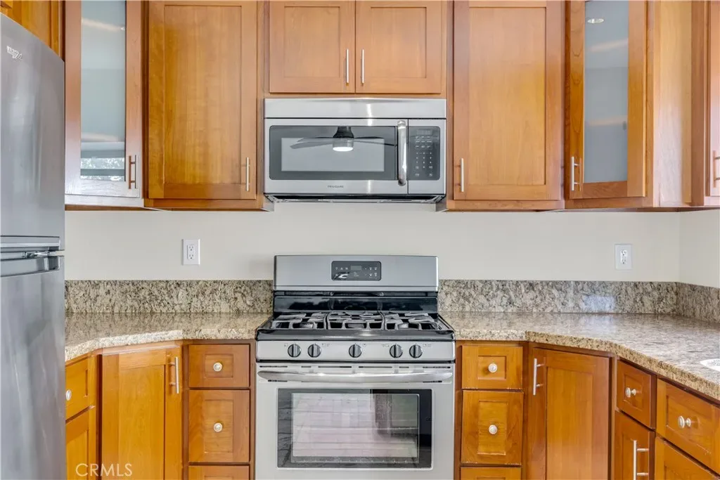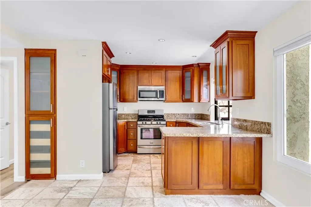 The main level is equipped with a contemporary kitchen, highlighted by recessed lighting, granite countertops, tumbled travertine flooring, and stainless appliances. Newly installed cabinetry includes soft-closing drawers, pullout shelves, and a corner Lazy Susan cabinet for convenient storage of pots, pans, or small appliances. A convenient half-bathroom is positioned between the kitchen, dining area, and living room.