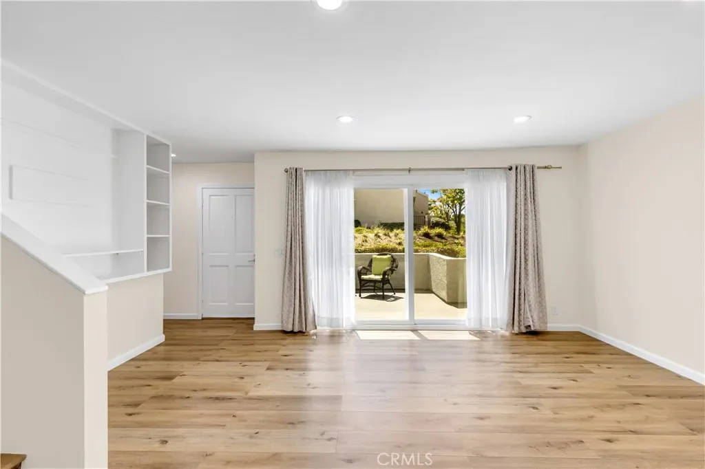 The open floor plan provides a large living room, making it ideal for families and guests. A custom-built entertainment center offers space for a large screen TV and multiple shelves for photos and keepsakes. The stairway to the garage is accessible from the side of the living room.