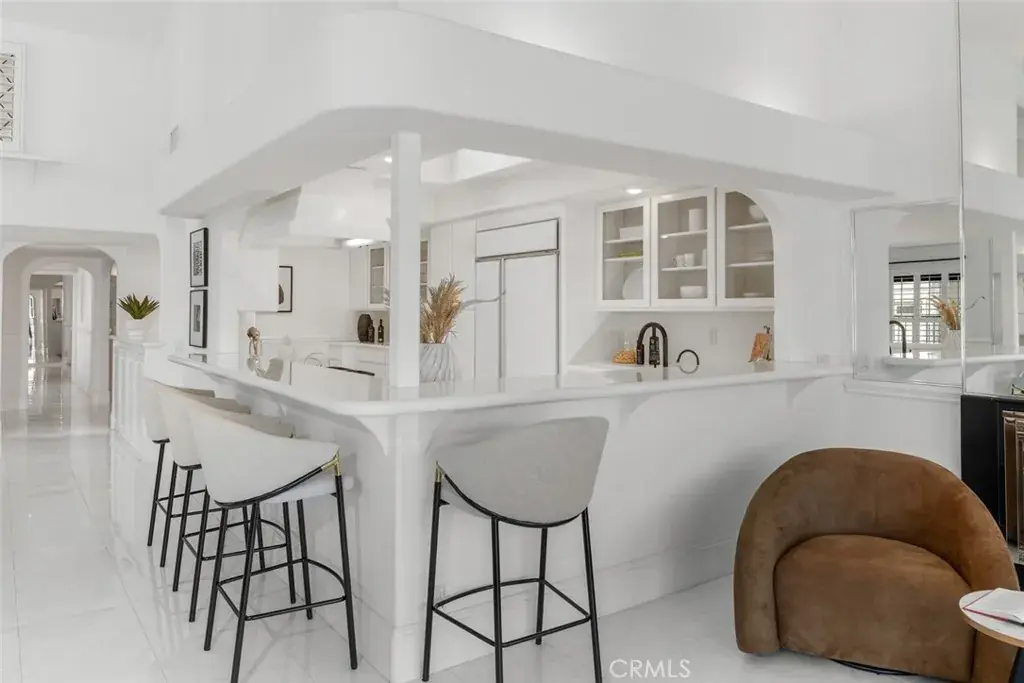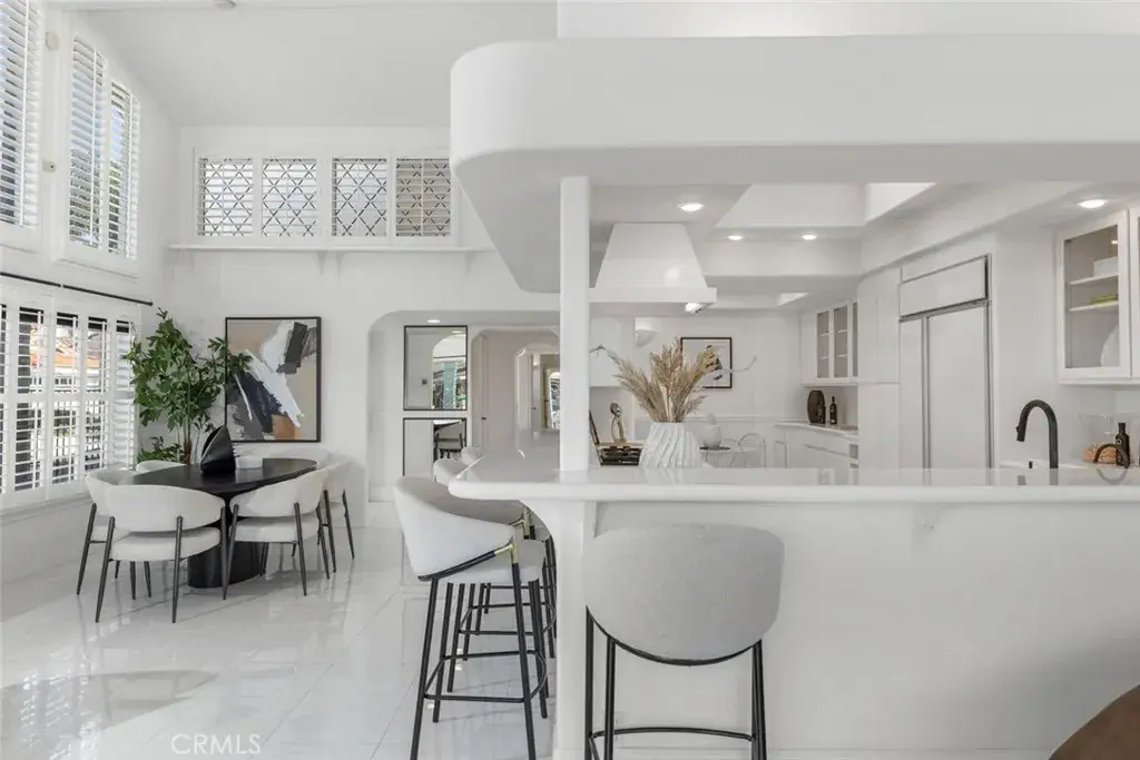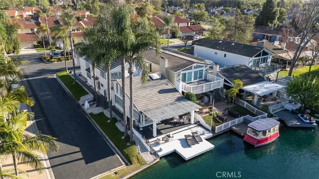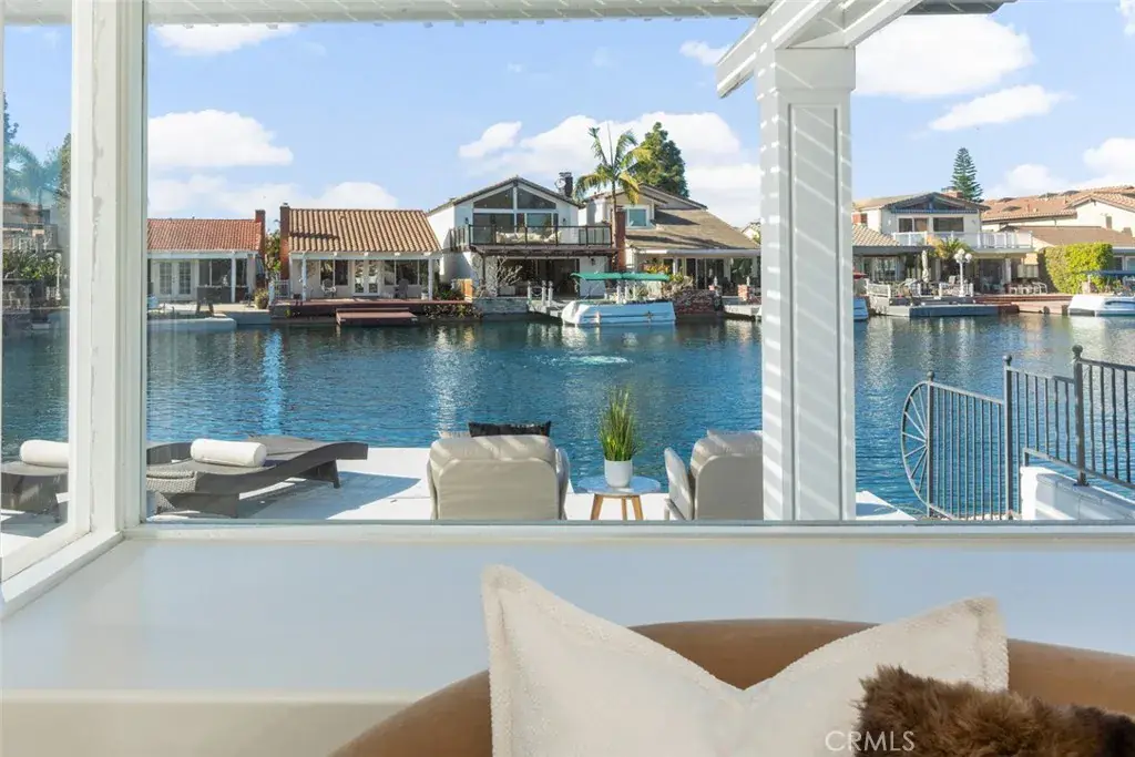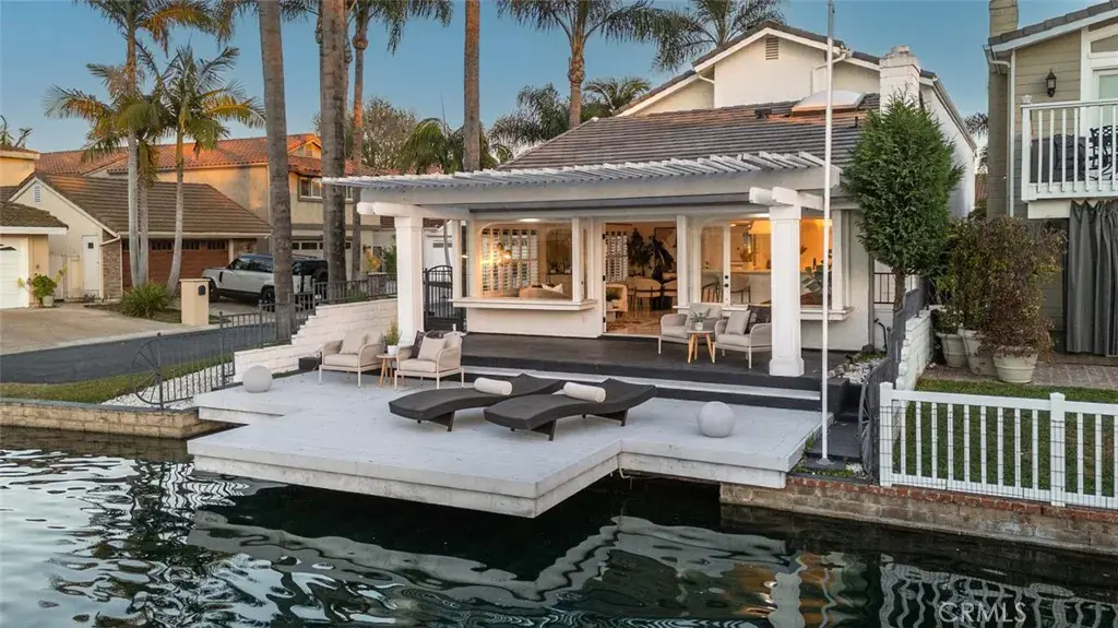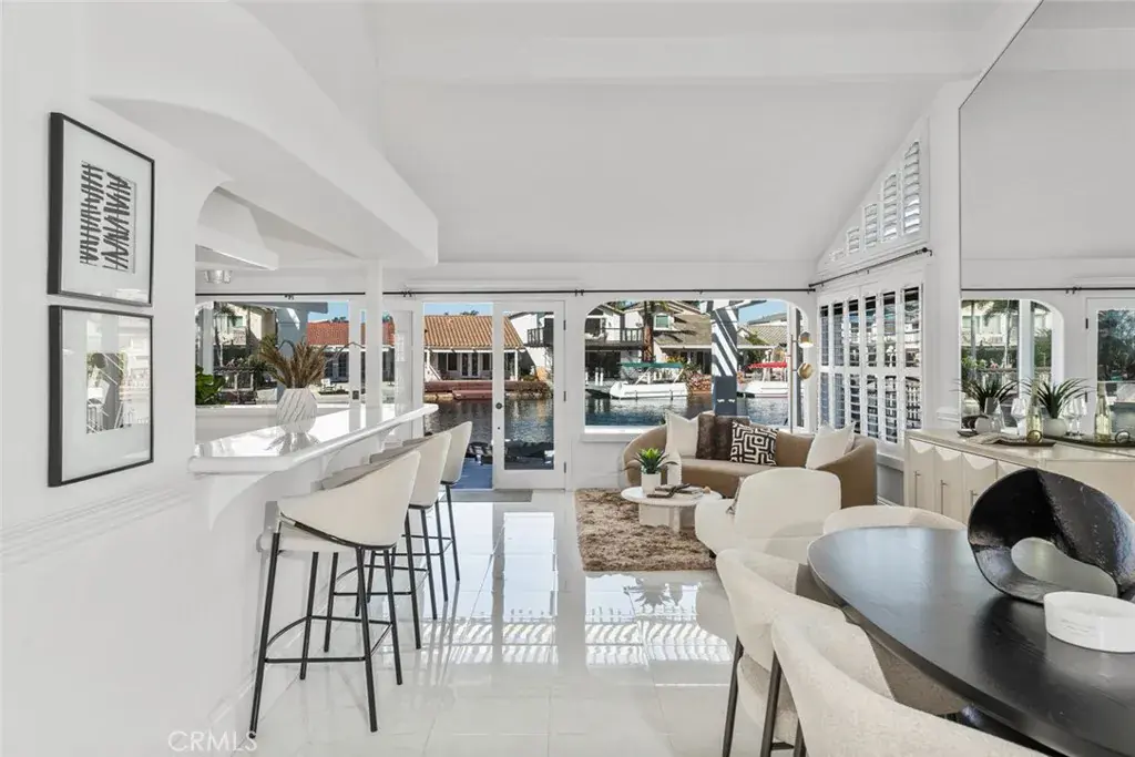 This residence reads less like a conventional home and more like a study in proportion, light, and reflection. Positioned on a rare inside corner lot, the property opens outward to a broad main channel panorama where the water widens and the horizon lingers. From nearly every vantage point, the lake becomes part of the composition, not simply a backdrop but a constantly shifting material that animates the house throughout the day. The exterior presents a restrained modernist language, crisp planes of white softened by shadow lines from mature palms and the geometry of the dock beyond. As the home wraps the corner, it reveals itself gradually, a sequence rather than a façade. The waterline deck extends like a continuation of the living space, dissolving the boundary between structure and shoreline. Inside, the plan unfolds with an almost gallery-like clarity. Surfaces remain intentionally calm, allowing volume and perspective to take precedence. Wide openings frame long water views that shift as you move, producing a subtle sense of procession through the home. The living spaces orient toward the channel, while softer, more intimate moments appear along the periphery, reading corners, curved seating arrangements, and layered sightlines that create both openness and refuge. The kitchen sits as a sculptural center rather than a separate room, its soft forms and pale palette reflecting daylight deeper into the interior. Two primary suites, one upstairs and one downstairs, allow the home to function across different rhythms of living. The lower suite maintains immediate connection to the water and outdoor terrace, while the second primary becomes a retreat elevated above the shoreline with a longer perspective across the channel. Outdoor living is treated as an extension of architecture rather than an addition to it. The covered terrace acts as an intermediary space, shaded yet open, where breezes move through and the sounds of water remain constant. The dock sits within the protected interior corner of the lot, reinforcing both privacy and the expansive feel of the main channel view. Boats pass at a distance, never dominating the experience, only punctuating it. Here, architecture becomes a lens through which the setting is continuously rediscovered, morning glassy and still, afternoon bright and active, evening quiet and reflective, each moment framed deliberately, each perspective considered.