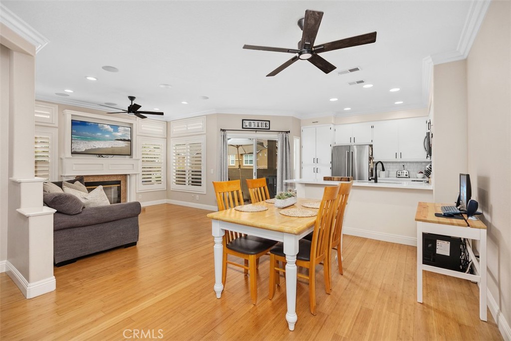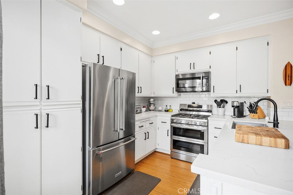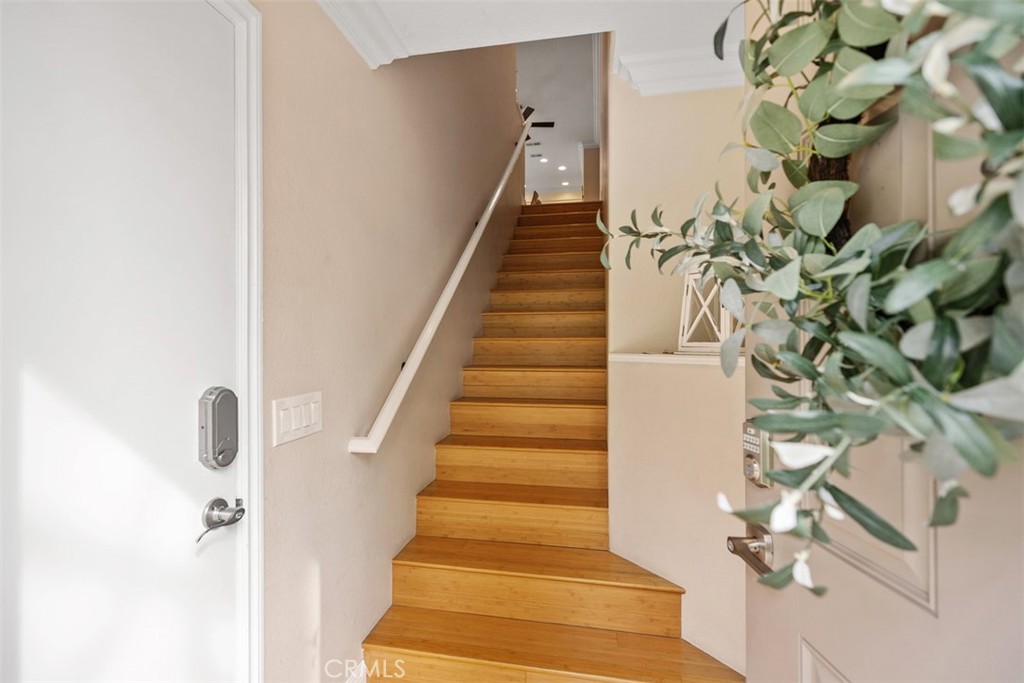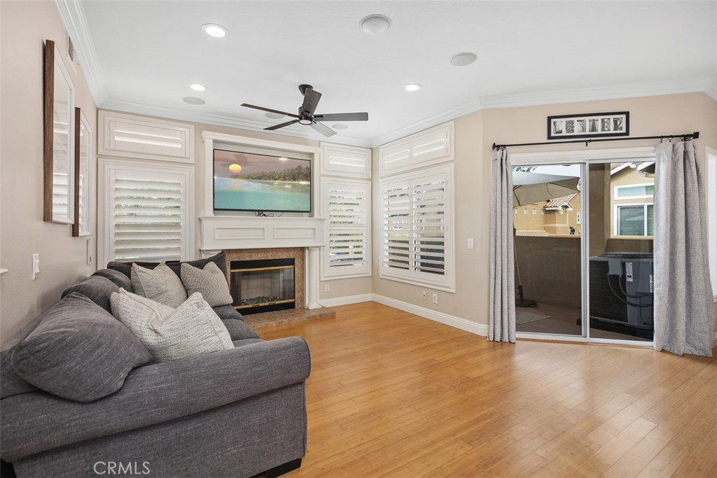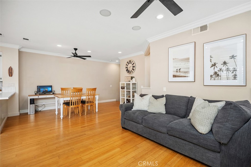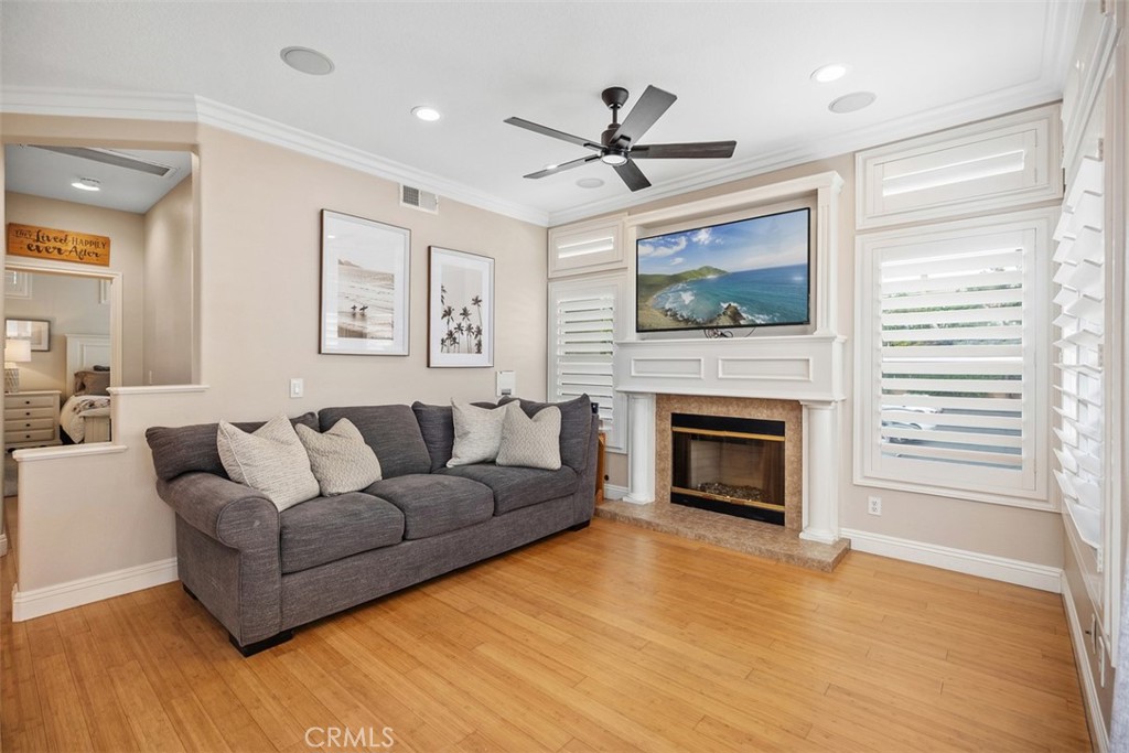 Welcome to this beautifully positioned carriage-style home where all the living spaces are thoughtfully located on one level above the convenient direct-accss one car garage. Perfectly located in the desirable Portola Hills community of Lake Forest. As an end unit, this home enjoys added privacy, and an abundance of natural light, along with the rare advantage of being adjacent to a private grassy greenbelt. This beautifully maintained 2-bedroom, 2-bath residence offers an open, light-filled floor plan and tasteful designer finishes including crown moulding throughout. A welcoming living area centers on a unique “fire & ice” glass fireplace and flows seamlessly to the open kitchen and the private outdoor balcony — ideal for morning coffee, evening BBQs or relaxing and unwinding.