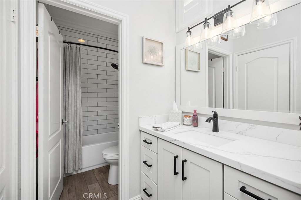 Both bedrooms are generous in size. The master suite has been thoughtfully updated with a full remodel — new vanity, soaking tub, modern tile surround in the shower, new porcelain tile and contemporary lighting. The second bedroom includes a custom shiplap wall and closet organizer for enhanced storage and organization.