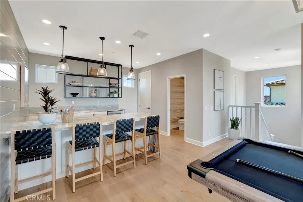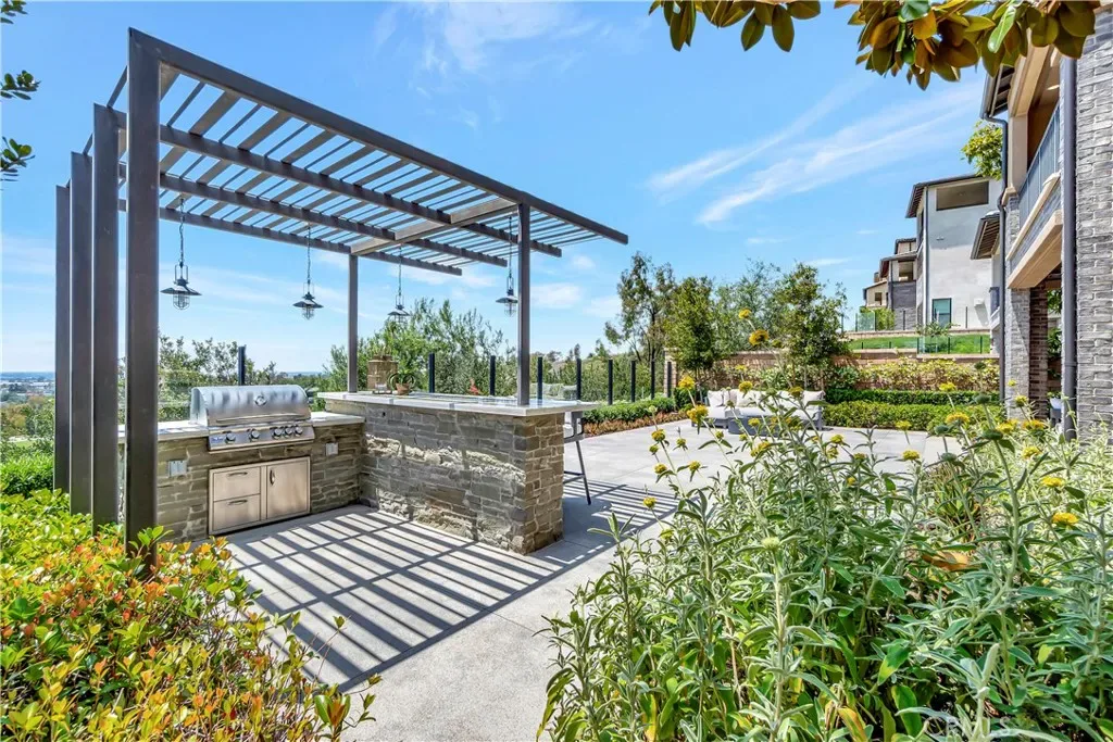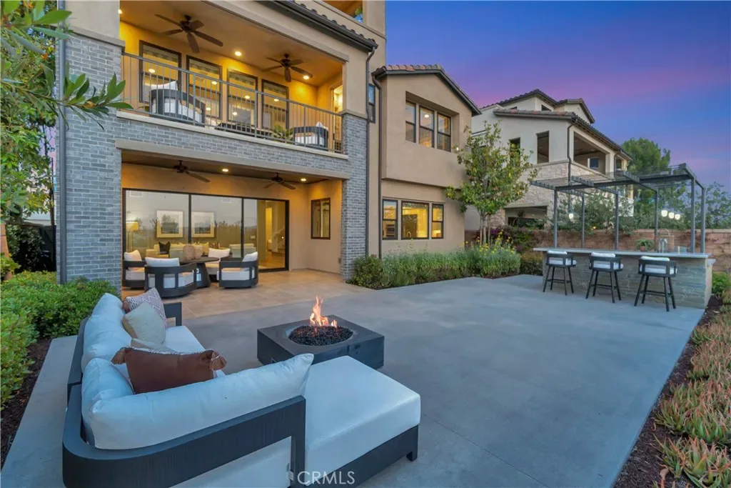 Originally built as a Teresina model home, this residence was designed as a showcase, capturing breathtaking panoramic views with luxurious upgrades throughout. Enter through the grand entryway with vaulted ceilings, setting the tone for refined, showcase-level living. Upgraded hardwood flooring and LED lighting flow seamlessly throughout the home. The gourmet kitchen features granite and quartz countertops, full-height tile backsplash, and top-of-the-line GE Monogram appliances, along with a spacious pantry featuring built-in open storage shelving. The great room showcases elegant wall paneling, a limestone fireplace, and stacking sliding doors that open to reveal sweeping views. The outdoor room, complete with ceiling fans and tongue and groove ceiling detail, is the perfect setting for outdoor dining and relaxation. The backyard features a pergola with a built-in BBQ island, perfect for hosting unforgettable gatherings. The first floor also includes an open-layout dining room, powder room with a limestone countertop, a den with built-in lighted cabinets and shelving, and a convenient bedroom with an attached bathroom featuring a quartz countertop. The second floor is home to a refined primary suite, offering expansive views and a private covered terrace with equally captivating vistas. The primary suite features a quartzite countertop, tile backsplash, and a GE Monogram wine chiller. Indulge in the primary bathroom, complete with quartzite countertops, floor-to-ceiling shower tiling, and a soothing rain can shower head. A large walk-in closet provides ample storage. The laundry room boasts white shaker cabinets and quartz countertops. The versatile loft space includes a wall-mounted TV pre-wire and charming tongue and groove wall detail. Two additional bedrooms, each with an attached upgraded bathroom, complete the second level. Ascend to the third story bonus room featuring a convenient kitchenette, white shaker cabinets, a granite countertop with waterfall edge, and a powder room. From here, step out onto the incredible roof terrace, where expansive panoramic views take center stage. The two-car garage offers a tankless water heater, epoxy flooring, and conduit for EV charging. This model home is a true showcase of refined design, premium upgrades, and breathtaking views.