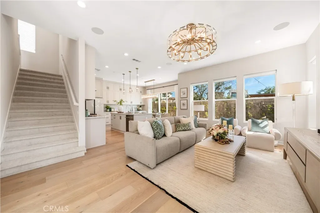 A striking three-story soaring ceiling anchors the home, complemented by southeast-facing windows on three sides that flood the interior with natural light. A grand crystal chandelier cascades through the vertical space, creating a stunning focal point as sunlight reflects across the home.