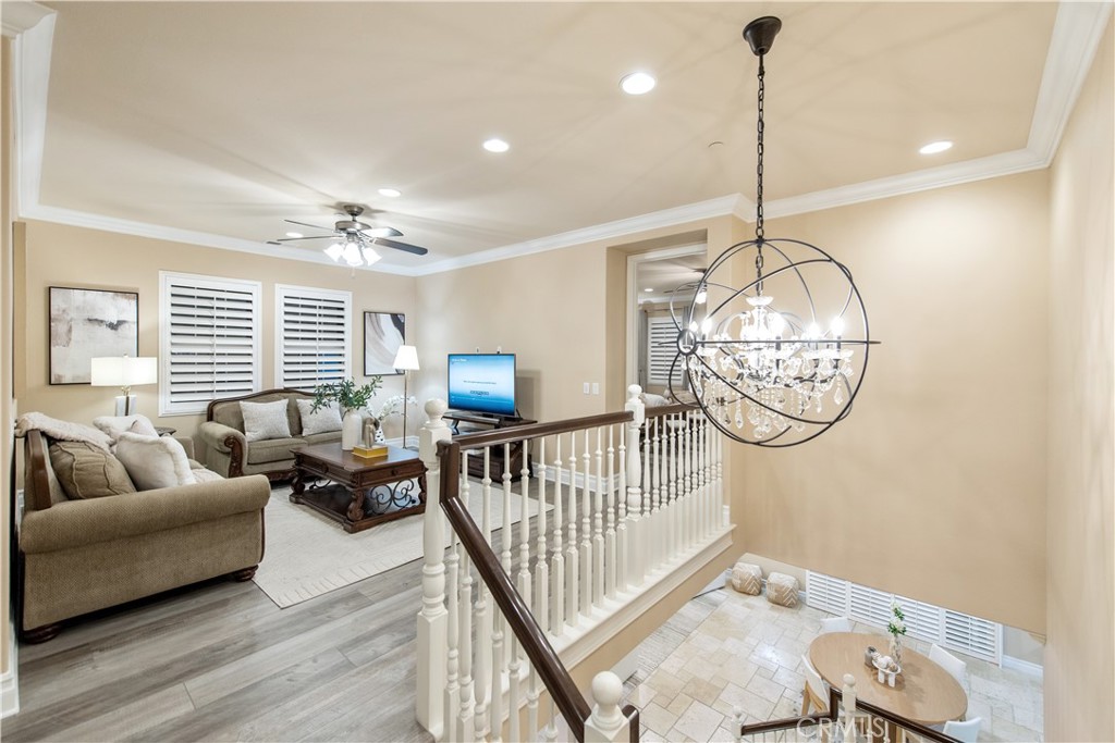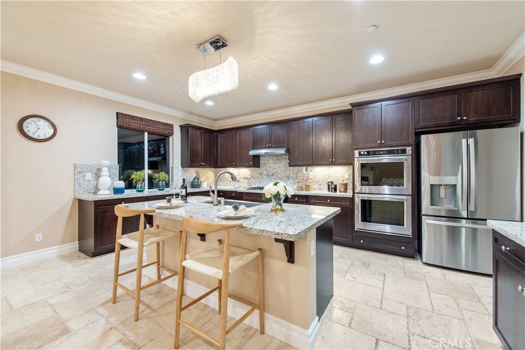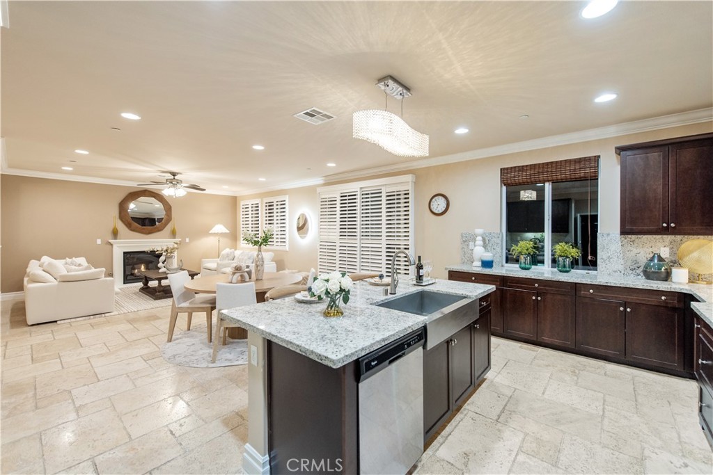 The interior showcases extensive luxury upgrades throughout, with elegant finishes, custom details, and designer lighting that create a refined yet welcoming atmosphere. The open chef’s kitchen features a large center island, upgraded stainless steel appliances, and a walk-in pantry, flowing seamlessly into the family room with a cozy fireplace—perfect for entertaining or everyday living.