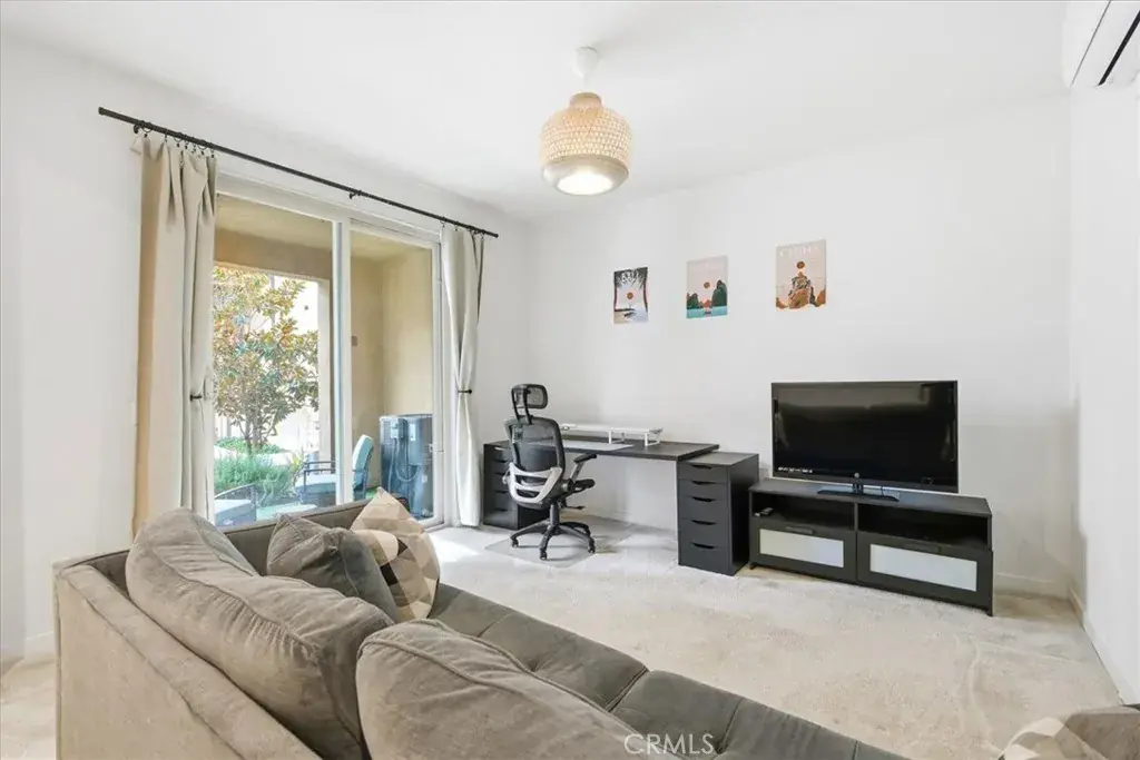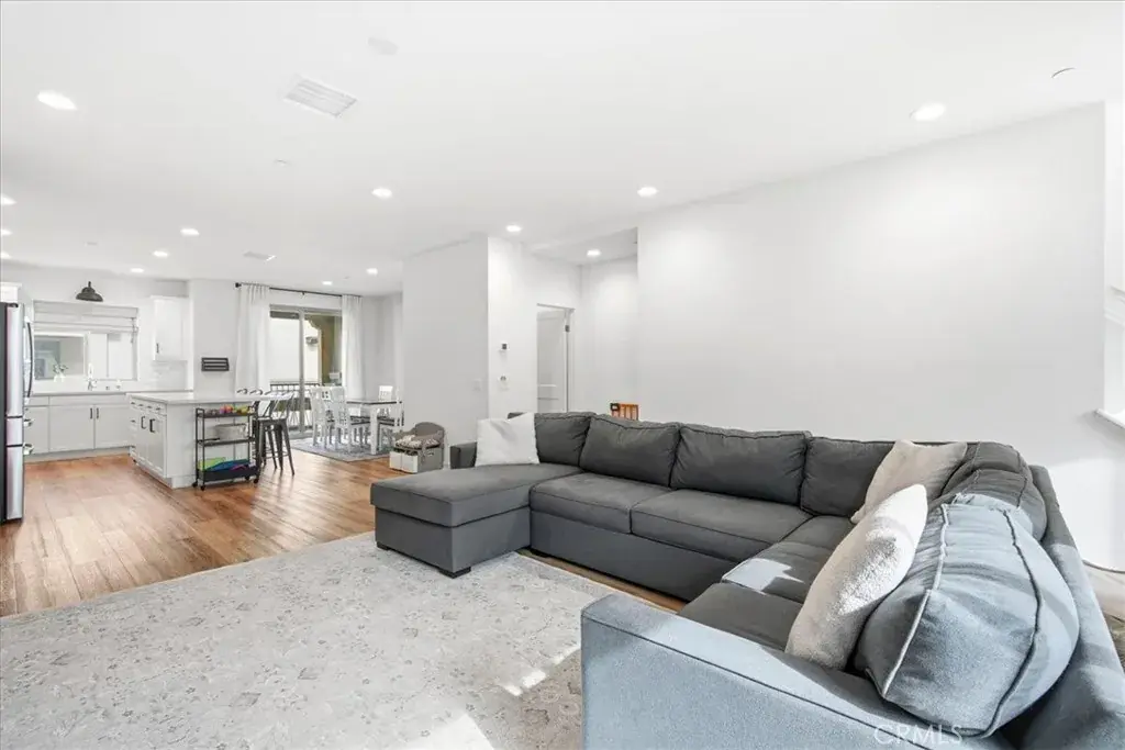 The light-filled living room showcases recessed lighting and sliding glass doors that open to another large private balcony, creating the ideal space to unwind or entertain.
