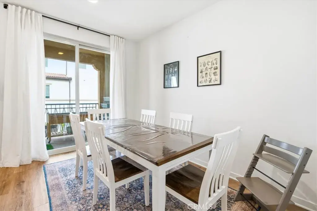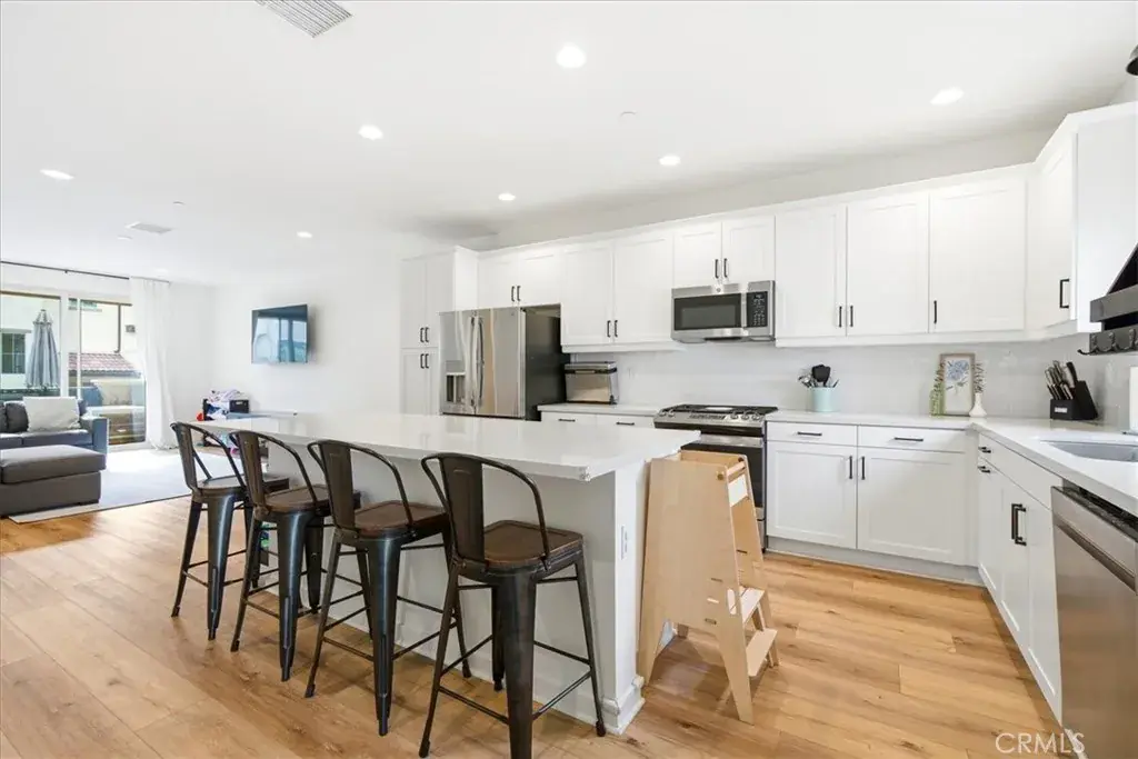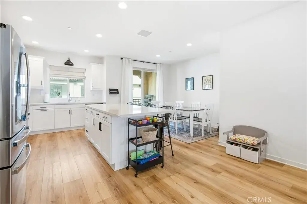 The heart of the home is the stunning gourmet kitchen, featuring quartz countertops, an oversized center island with breakfast bar seating, abundant cabinetry, stainless steel appliances, and an adjacent dining area that flows effortlessly to the covered balcony — perfect for hosting gatherings or enjoying relaxed evenings at home.
