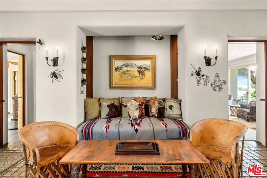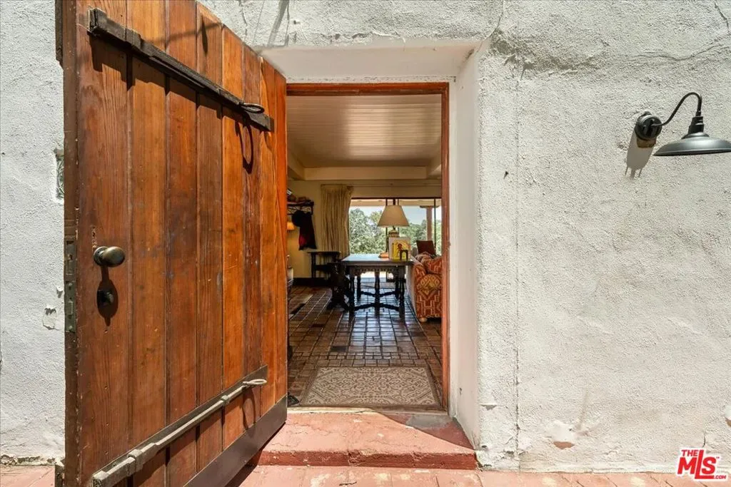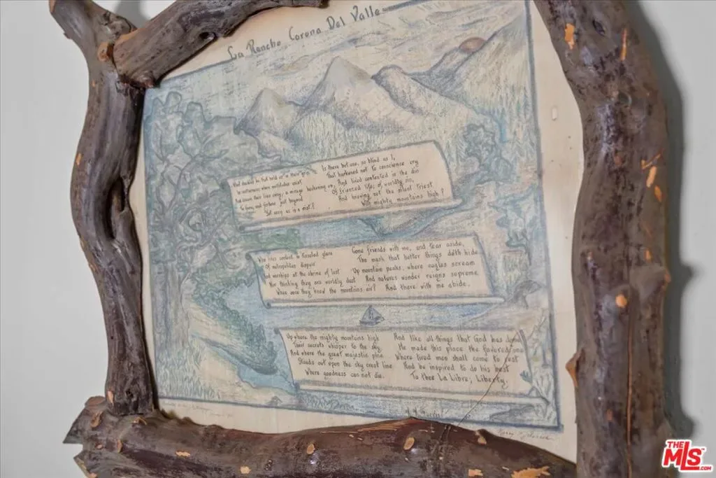 Rancho Corona Del Valle rests gently against the Angeles National Forest. Its 333 acres of pastures, aged oaks, storied 17 stall barn, and charming abodes command views across the famed Tejon Ranch. Here, located between 700,000 acres of Angeles National Forest and the 270,000 acre Tejon Ranch, you’ll enjoy the expansive and private feeling of a big Texas ranch while only being one hour from Los Angeles. Rancho Corona Del Valle is steeped in history and has hosted several Hollywood legends. The ranch was long ago owned by the same family that held Westwood and the land where UCLA now stands. After its place in the Classic Hollywood film era, Rancho Corona Del Valle was a coveted quarter horse racing farm, known for horses like Top Rocket, and other steeds’ illustrious wins at Los Alamitos racetrack. A yearly race in their honor continues. The main four bedroom hacienda of 4200 s.f. dates to 1883, and is jeweled with Batchelder tile, a romantic courtyard, old wooden doors, a peaceful veranda overlooking pastures and valleys, simply too many architectural treasures to name. The four guest homes ranging from 900-1800 s.f., are charming, reflecting a rich vintage ranch esthetic. In addition to the five residences there are five cottage/bungalows dotted throughout the property. On warm days jump in the swimming hole, a large water reservoir seated at the crown of the hill with breathtaking views (appx 80 ft wide x 50 ft long x10 ft deep). This ranch has fantastic natural water/wells, and a 30,000 gallon holding tank. Ride the ranch’s dirt roads and trails, gallop the old furlong race track (currently needing new footing and fencing), pick fruit from the orchard (apricot, nectarine, peaches, apple, pomegranate, plum, cherry), practice riflery at the shooting range, or venture into the hills to feel the glory of nature. Ranches like Rancho Corona Del Valle are held for generations and rarely grace the market. The opportunity to buy such a piece of California history is truly rare. Buyer to verify all zoning, permits, square footage, acreage amount and land uses. Square footage is approximate and includes 5 cottages and 5 homes. Sale includes multiple APN’s which total 333 acres. The barn area also offers a large chicken aviary, a round pen and a vintage roping arena of appx 250×80 ( both round pen and arena in need of new fencing and footing and have an old squeeze shoot/return alley).
