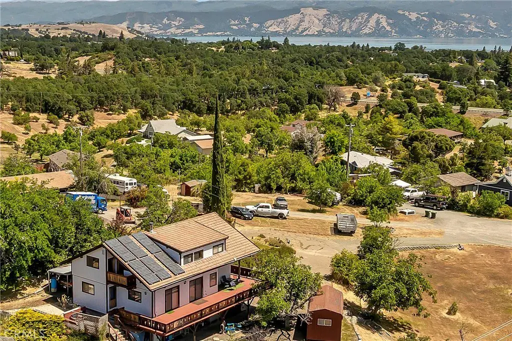 Large & lovely Chalet style home on 1 acre in Lakeport! Complete with a beautiful lake and Mt. Konocti view, this well maintained 4bed/3bath approx. 2497sqft home is perfect for so many different buyers. Main level of home features a nice open kitchen, large living room, office, laundry room, & a fantastic attached deck looking out towards the Lake and hills. Upper level includes primary bed/bath & two guest bedrooms (great layout for kids room with a neat design and pine walls!) & guest bathroom. Lower level features a locked off IN-LAW type unit with 1 full bedroom, living area (currently used as gym room) 1 full bath, & a full kitchen. Perfect set up for the in laws, teenager space, or even a vacation/short term rental unit! Has separate entrance, but can also be accessed from the main home if you’d prefer. All electric home with OWNED & paid for SOLAR. Huge yard, fenced garden area, & lots of parking with room for travel trailer/RV, plus attached 2 car garage. Includes TWO detached nice storage sheds. Convenient location, right outside of Lakeport City limits, but only about 2 minutes drive to Main Street or Hwy 29.Tons of value here with this large & even home on some land! Full reports on file 2025.