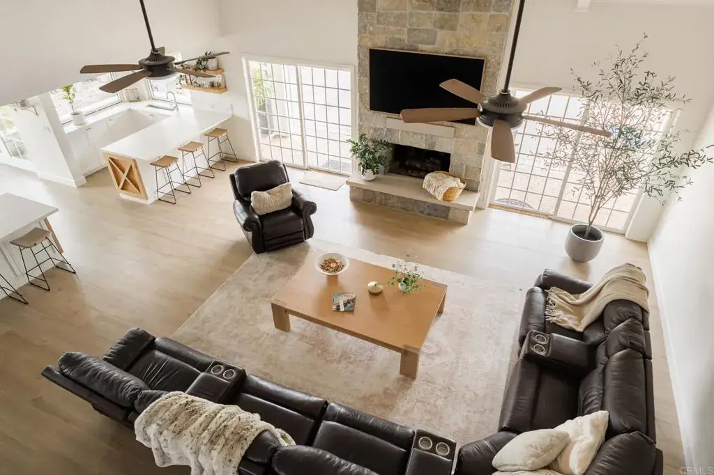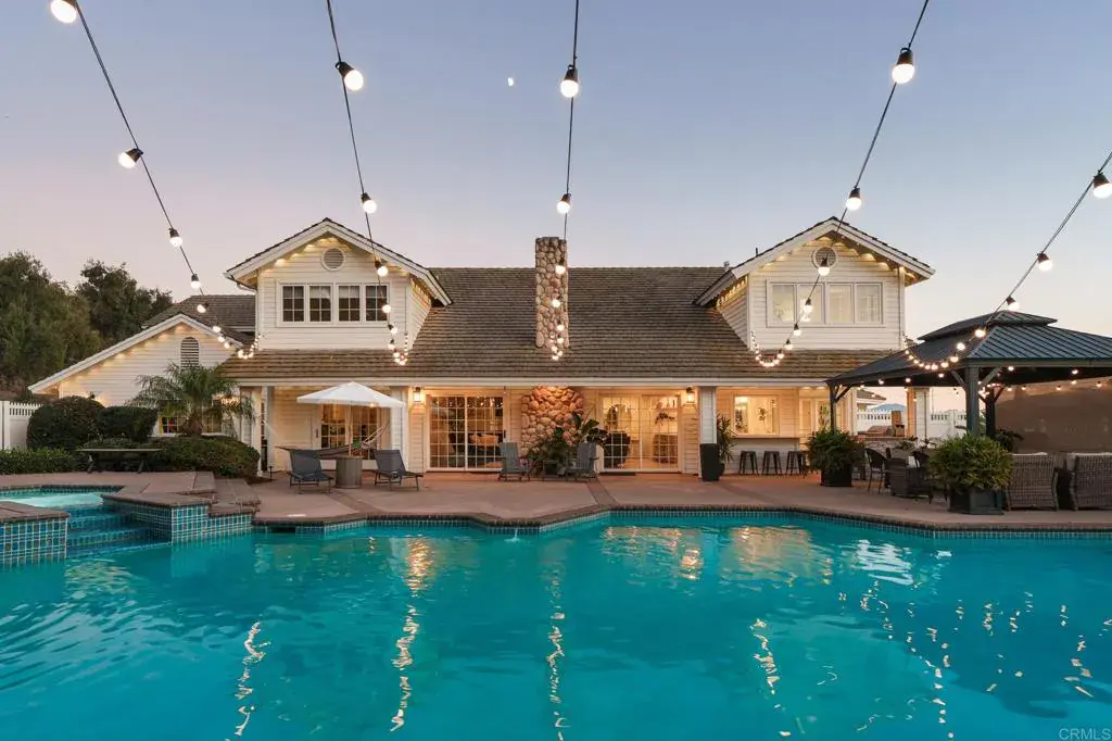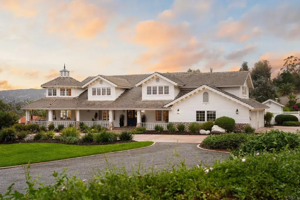 A rare offering of custom farmhouse-modern luxury on over an acre at the base of Eucalyptus Hills in Lakeside. This 4,650 sq ft estate blends architectural charm with elevated design, creating a truly one-of-a-kind living experience. The covered wrap-around front porch provides a welcoming feel to the home. As you walk past the entry you will find the high ceiling great room featuring a stunning stone fireplace and open-concept living. The remodeled chef’s kitchen showcases a large center island, breakfast bar, modern finishes, expansive cabinetry, and a generous pantry—ideal for both everyday living and entertaining. Designed for seamless indoor-outdoor enjoyment, the entertainer’s bar opens through pass-through windows to the backyard, connecting to the outdoor BBQ, warming station, counter seating, fire-pit and resort-style pool area. The sparkling pool includes an attached spa, waterslide, and a dedicated pool bathroom, creating a private backyard retreat with peaceful views and exceptional privacy. The luxurious primary suite features a spacious sitting area, spa-inspired bathroom with walk-in shower, soaking tub, dual vanities, and generous storage. One bedroom is conveniently located downstairs, along with a private office featuring charming built-in cabinetry. Upstairs, there are two additional bedrooms, plus an oversized bonus room currently serves as a bedroom, offering flexible living options. Additional highlights include a three-car garage with epoxy flooring and built-in cabinetry, plus gated concrete RV and recreational vehicle parking. This extraordinary property offers paid for solar, space, sophistication, and resort-style amenities rarely found in Lakeside.