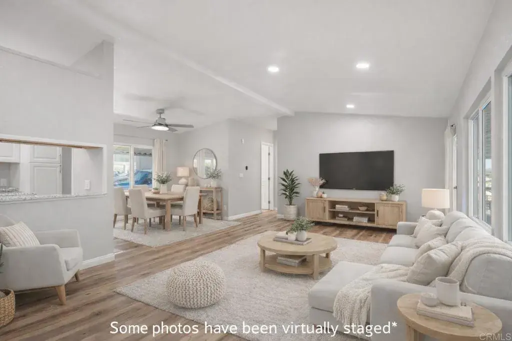 FREE 1ST MONTH OF SPACE RENT WITH ACCEPTABLE OFFER. Turnkey, remodeled home with mountain views! Welcome to 13490 Highway 8 Business #8 in Lakeside. This bright, open 3-bedroom, 2-bath home features vaulted ceilings, recessed lighting, and brand-new vinyl flooring throughout. The updated kitchen offers modern cabinetry, new appliances, and ample counter space, while both bathrooms have been stylishly remodeled for a fresh, contemporary feel. The split floor plan provides privacy, with the primary suite featuring its own en-suite bath. Additional highlights include a large laundry room, central A/C and heat, dual-pane windows, and a newer roof. Step outside to enjoy the oversized porch with scenic mountain views, a freshly mulched yard, and a storage shed. Located in a welcoming, family and pet-friendly community with a pool and clubhouse, this home offers the perfect blend of comfort, privacy, and convenience—just minutes from shopping, dining, schools, and freeway access.