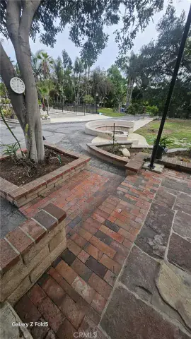 The expansive paved courtyard easily hosts large gatherings and events, while a covered outdoor dining structure beneath mature trees creates a shaded and inviting space perfect for al fresco dining or relaxing evenings. The resort-style outdoor amenities include a beach-entry heated pool, Jacuzzi spa, built-in grilling area, natural gas fire pit, multiple seating areas with raised brick planters, mature landscaping, and shaded lawn spaces framed by palm trees, creating a private retreat atmosphere.