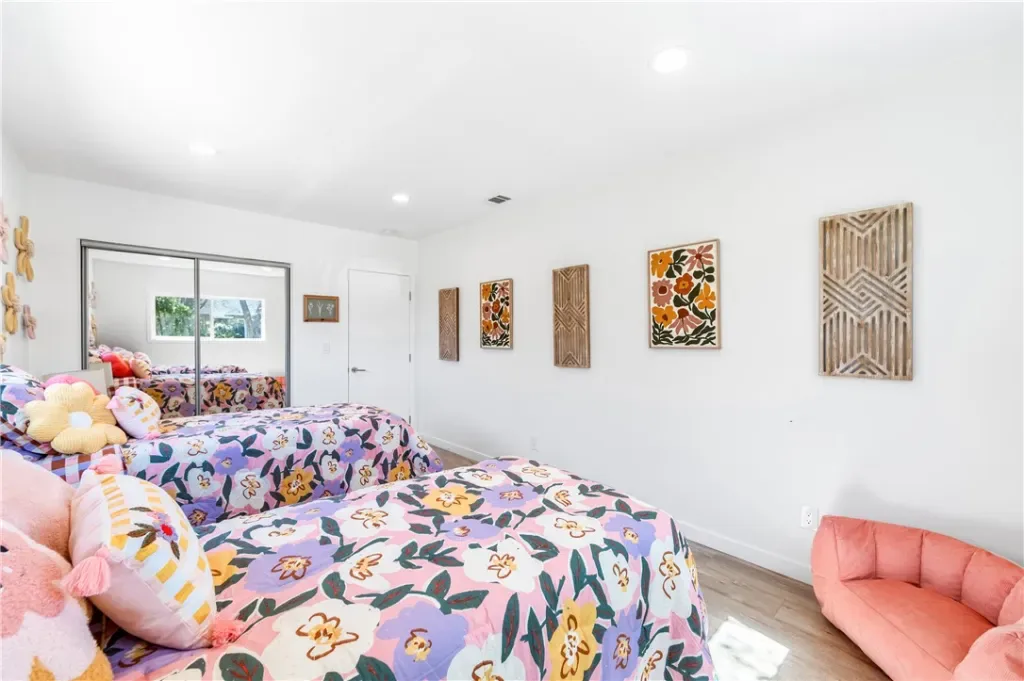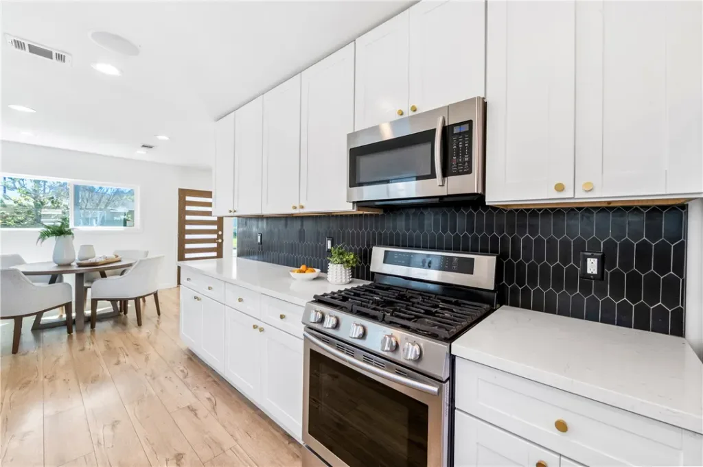 Where modern design meets everyday livability, this extensively remodeled single-level home on a tree lined street in Lakewood offers a rare blend of quality, comfort, and thoughtful upgrades. Reimagined with over $100,000 in improvements, this residence delivers a light filled, open layout designed for effortless living and entertaining. From the moment you arrive, the home sets the tone with clean lines, mature landscaping, and a welcoming presence. Inside, expansive dual pane white vinyl windows and sliding doors fill the space with natural light, highlighting the open-concept floor plan and seamless flow between living areas. At the heart of the home, the kitchen combines form and function with an impressive 15-foot layout featuring Carrera quartz countertops, white shaker cabinetry, on trend black tile backsplash, and a commercial-grade stainless steel sink with professional-style faucet. A Samsung appliance suite completes the space, creating a kitchen that is both stylish and highly functional for everyday living. Both bathrooms have been thoughtfully redesigned with a focus on durability and design, featuring tile work set over cement walls, wood-look tile flooring, and upgraded fixtures throughout. The primary bath offers a spacious walk-in shower with frameless glass enclosure, dual sink vanity with quartz countertop, and expansive mirror detail, creating a clean and modern retreat. A unique bonus space, approximately 168 square feet with vaulted ceilings and direct access off the garage,adds flexibility for a home office, gym, studio, or guest retreat.