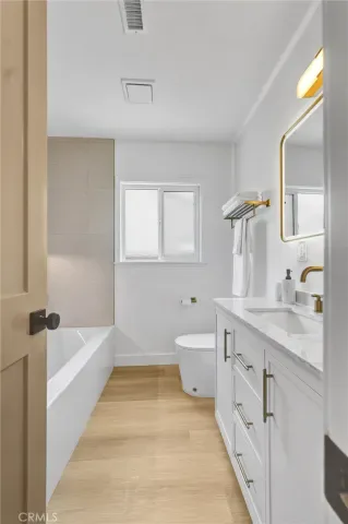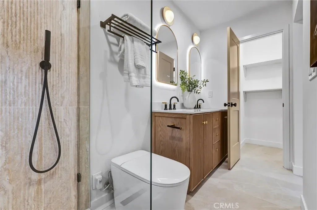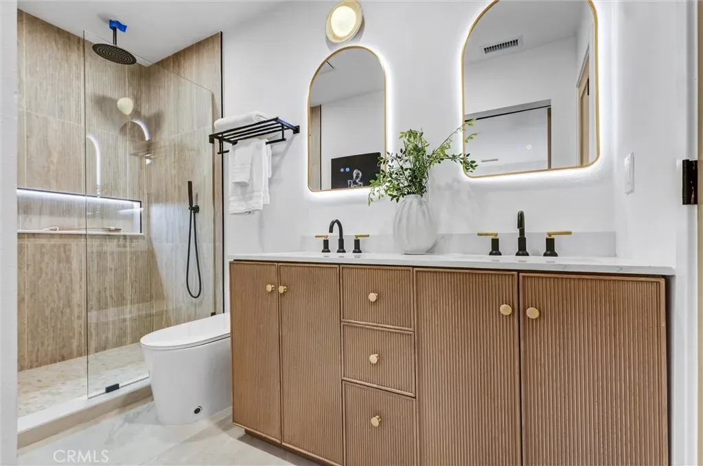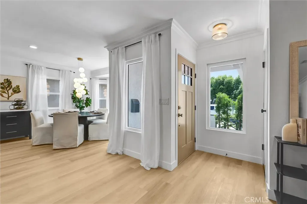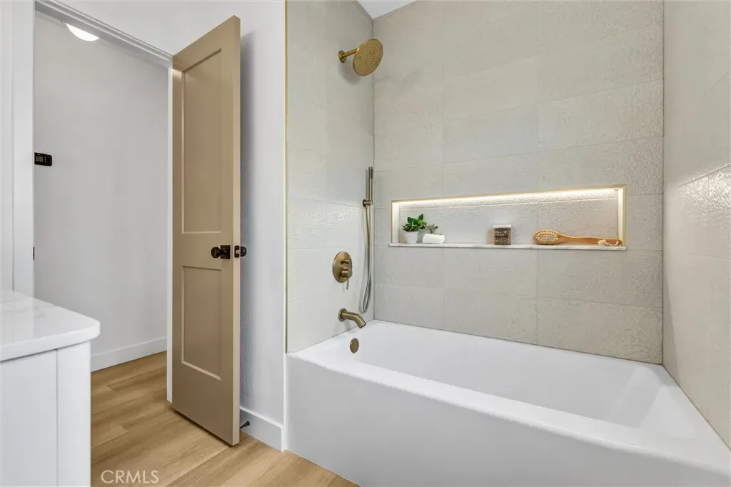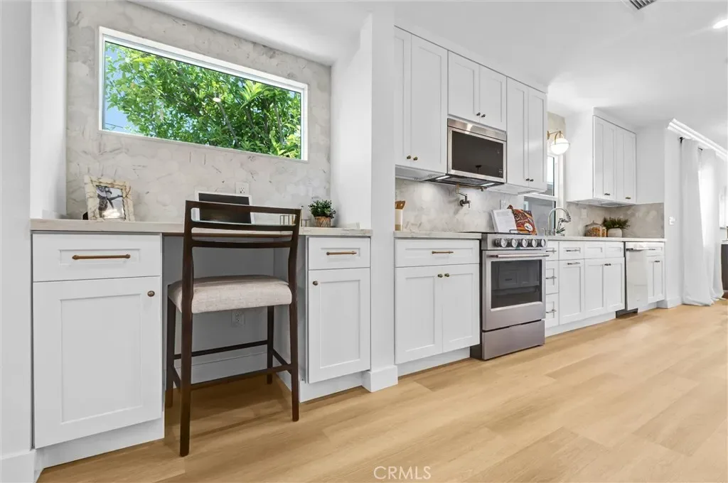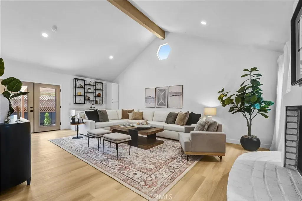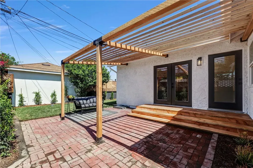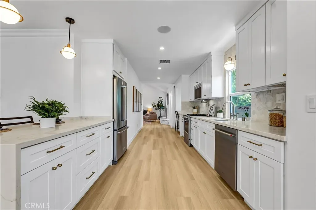 Stunning luxury upgraded Lakewood home on a rare cul-de-sac. This beautifully updated 3-bedroom, 2-bath home offers nearly 1,700 sq ft of modern luxury in one of Lakewood’s most desirable and quiet cul-de-sac locations. Enjoy the convenience of being moments from Cerritos Mall, dining, and everyday amenities while tucked away on a low-traffic street ideal for those seeking privacy and calm. Step inside to an open floor plan featuring a formal living and dining area with a charming bay window. The gorgeous chef’s kitchen showcases brand-new KitchenAid appliances—including counter depth refrigerator, microwave, gas convection range, and dishwasher – paired with white shaker cabinetry, Calcutta Queen quartz counters, marble backsplash, pot filler, custom lighting, and a peninsula with waterfall edge. A spacious family room with vaulted ceilings becomes the heart of the home, complete with a gas fireplace, recessed lighting, custom built-in bar with beverage cooler, wine/liquor rack and French doors leading to a new covered patio. The home is loaded with premium upgrades: whole-house sound system, central heat and AC, dual-pane windows, all-new doors, two-panel shaker interior doors, crown molding, and upgraded base and casing. The large primary suite features a fully remodeled bathroom with designer touches rarely found at this price point -dual vanity with built-in USB/power outlets, heated mirrors, lighted shower niche, and a smart toilet. The stunning hall bath mirrors the same level of luxury with a new vanity, smart toilet, heated mirror, and real marble light fixture. Outside, the home shines with new exterior paint, fresh landscaping, new sod, automatic sprinklers, and upgraded lighting. The front yard features custom courtyard fencing and newly planted ficus trees designed to grow into a private green screen. The backyard is a peaceful retreat with brick patio, new fencing, and lush landscaping. Additional highlights include a finished 2-car garage with direct home access, new garage door and opener, copper plumbing, and a new Rinnai tankless water heater. Located near highly rated Lindstrom Elementary. This turnkey home blends thoughtful design, luxury upgrades, and an unbeatable cul-de-sac location.