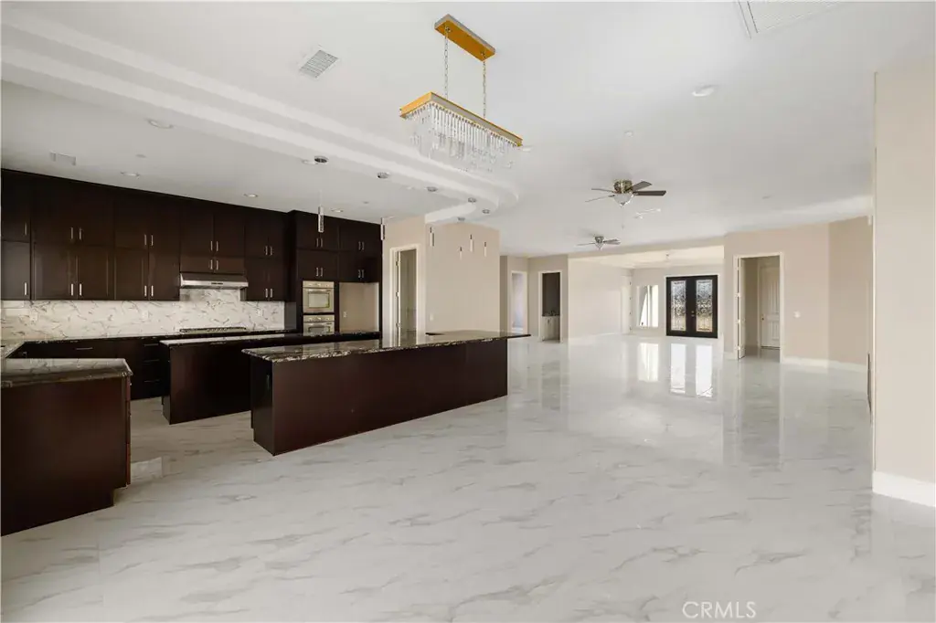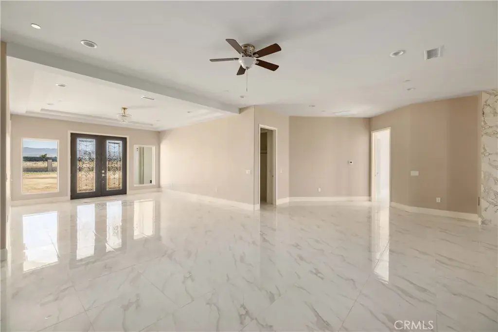 This custom home is in a rural area with room to raise horses and other animals. It is freeway close to commute. Enter through the custom glass doors to an open concept entry, living room, and dining room. The kitchen features two islands, dual ovens, five burner stove, wine cooler, and walk in pantry. Casual dining can be set up at one of the islands. The dining area is nearby with access to the covered patio. The fireplace is placed so that the large screen flat screen television can be placed on the wall above it. There are two primary bedrooms with on-suite bathrooms; another two bedrooms share a Hollywood style bathroom; and, one bedroom can be used as a guest room, den, studio, and much more. There is a bathroom nearby. The floors are exceptional with a custom medallion in the entry. Got vehicles? There are two – two car garages; one on each side of the house. One has additional space for a work bench and tools. The lot features extra room to build a pool area. And beyond that can be the area for animals. The solar system is paid.