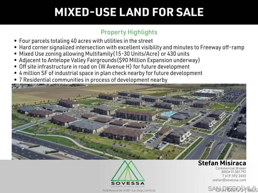 40 acres of prime mixed-use land at the signalized intersection of Avenue H and 30th Street in Lancaster. Zoned for Mixed-Use, allowing multi-family (15-30 units/acre, up to 430 units), business park, and light industrial, this site is ideal for investors or developers seeking to capitalize on the regions growth. With all utilities available in the street, off-site infrastructure on W Avenue H, and proximity to a freeway off-ramp, the property offers excellent visibility and access. Adjacent to the Antelope Valley Fairgrounds, currently undergoing a 90 Million expansion, the site is poised for success in a thriving market. Antelope Valleys aerospace hub, anchored by Northrop Grumman, Lockheed Martin, and NASA, employs over 20,000 well-paid professionals. Long-term contracts, including 80 Billion for B-21 bomber jets, AI and robotics programs, and the Supersonic X-Plane, drive economic growth. Increased activity at USAF Plant 42 creates immediate technical and assembly jobs, with over 2,500 new positions generating 6,000+ support jobs locally. Lockheed Martins new 208,000 SF high-tech manufacturing facility (2022) highlights the regions commitment to growth. With no new apartment construction in over 30 years, the Antelope Valleys affordability fuels a robust rental market, making this site a prime opportunity. Strategic Location: 40 acres across four parcels at a hard corner signalized intersection with excellent visibility, minutes from a freeway off-ramp. Flexible Zoning: Supports multi-family (up to 1,200 units), business park, or light industrial development. Development-Ready: Utilities in the street and off-site infrastructure on W Avenue H in place. Nearby Growth: Adjacent to the 90 Million Antelope Valley Fairgrounds expansion, with 4 Million SF of industrial space in plan check and seven residential communities under development nearby. High Demand: Severe housing shortage with strong rental demand driven by affordability and aerospace job growth. Economic Momentum: Aerospace-driven job creation and major investments position Lancaster for long-term growth.