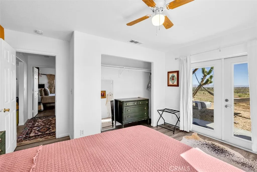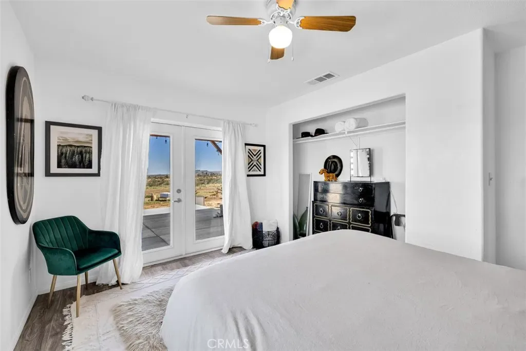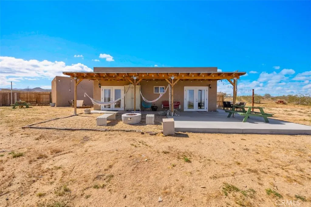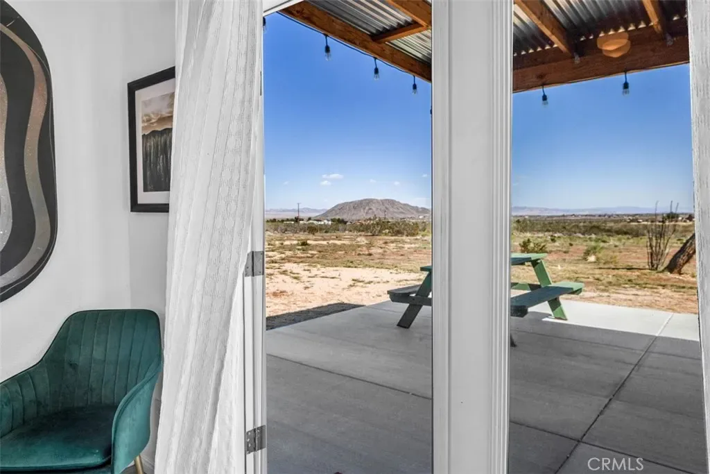 Both bedrooms feature French doors that open to a shaded back patio, creating the perfect place to relax while taking in the surrounding desert landscape and mountain views. The living room also features French doors leading to a charming patio area, offering seamless indoor-outdoor living and multiple spaces to enjoy the serene setting.